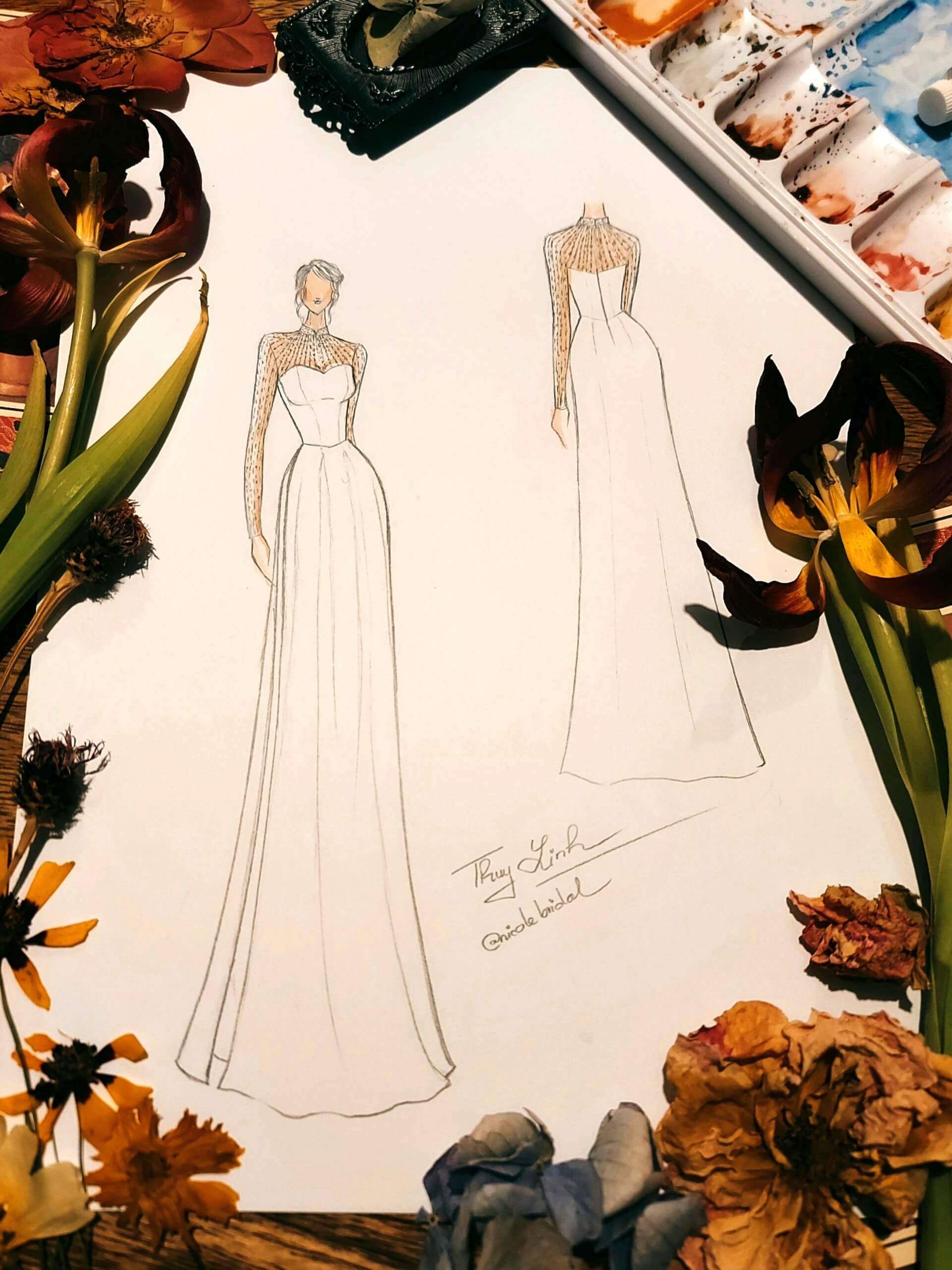 Bước 3: Chọn chất liệu và vẽ sketch: vì may đo áo dài cưới có rất nhiều chất liệu như nhung, voan, lụa… nên chúng mình sẽ tư vấn giúp nàng lựa chọn chất liệu phù hợp nhất với ý tưởng thiết kế áo dài.