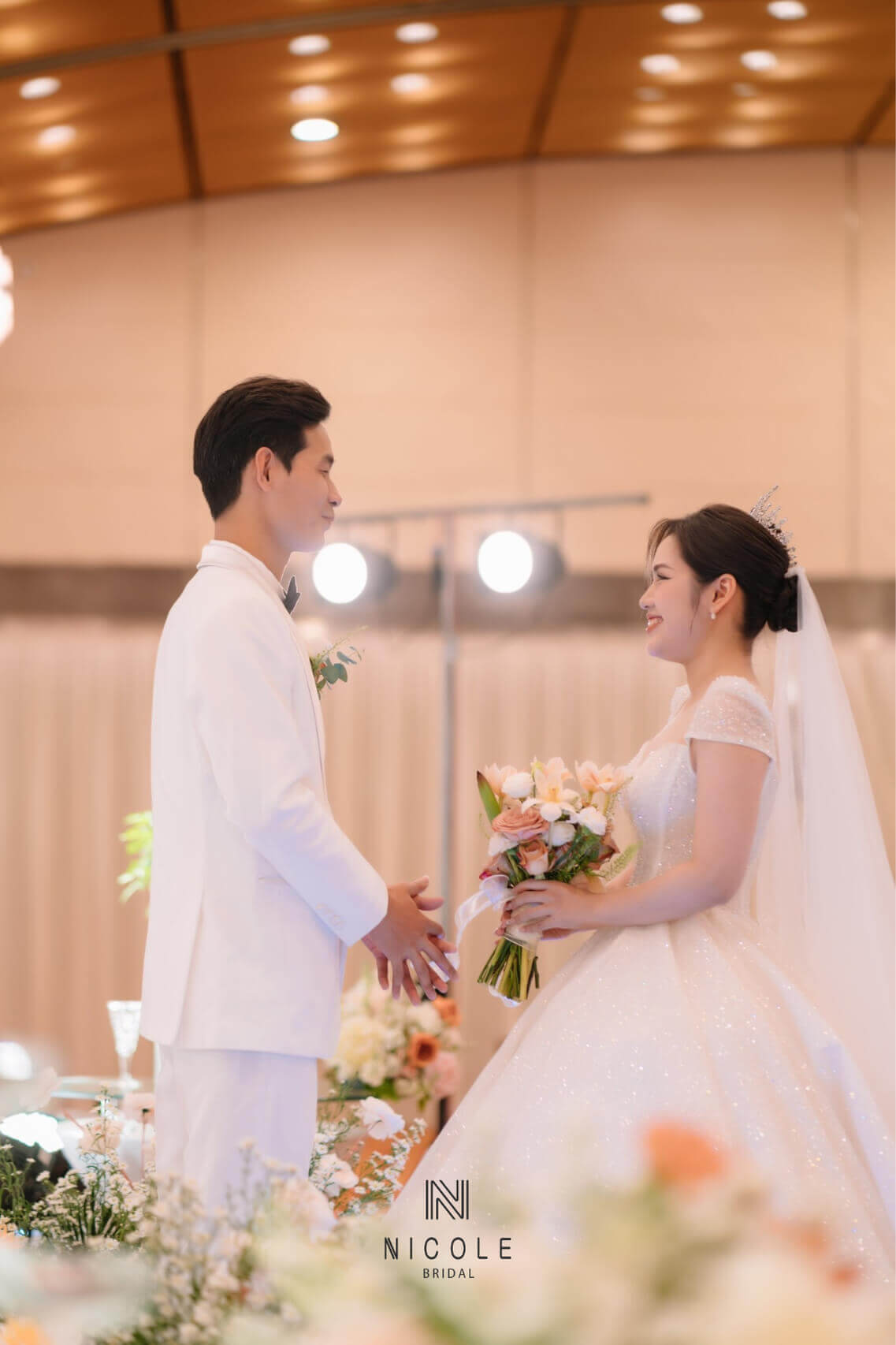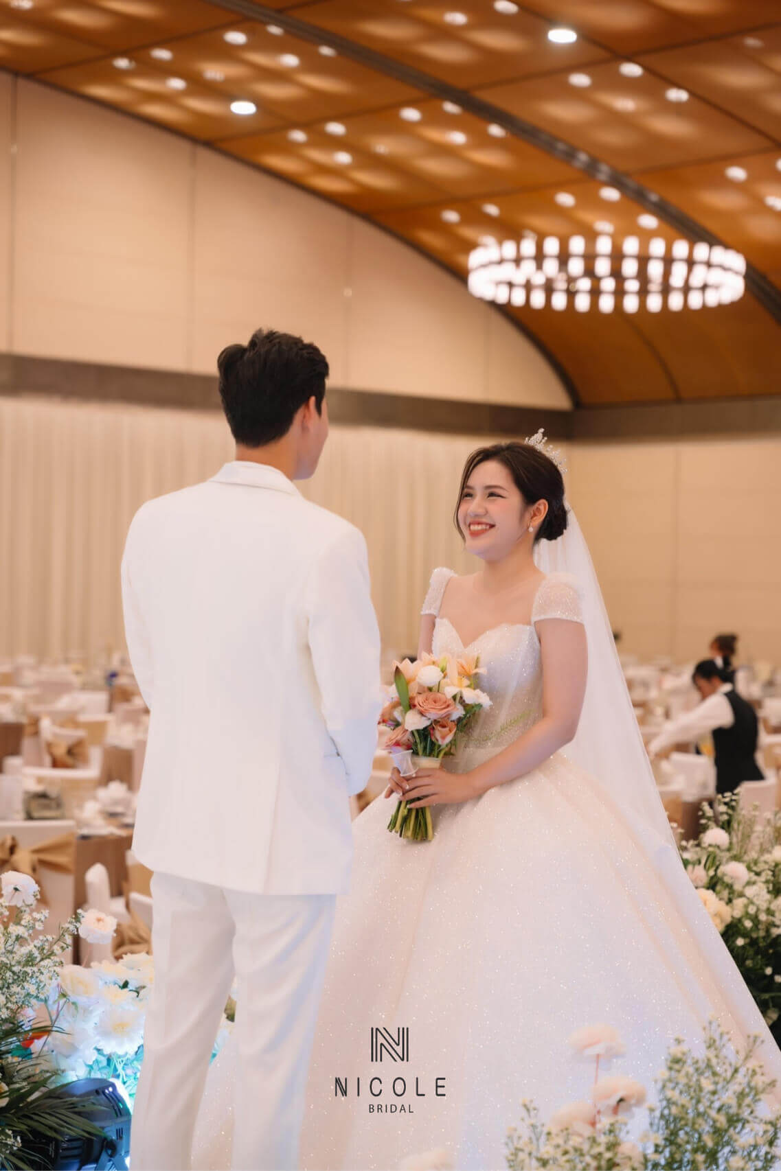 Trong ngày trọng đại, cô dâu Bảo Trân đã lựa chọn hai chiếc váy cưới công chúa mà nhà Nicole Bridal đặc biệt chuẩn bị. Mỗi thiết kế mang một nét đẹp riêng, tôn vinh trọn vẹn cảm xúc của nàng dâu trong từng khoảnh khắc.