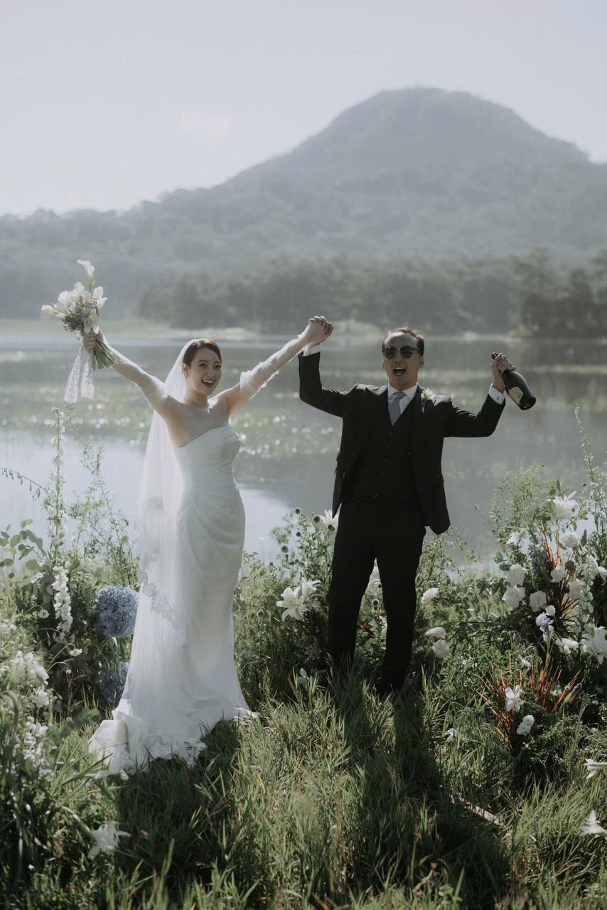 Hương Giang lựa chọn một thiết kế váy cưới đơn giản, tinh giản trong phom dáng nhưng đầy chất thơ trong từng đường nét. Chiếc váy cưới nhẹ nhàng ôm lấy cơ thể một cách tự nhiên, rơi mềm theo từng bước chân, như hòa tan vào không gian trong veo của cao nguyên. Không cần quá nhiều chi tiết cầu kỳ, vẻ đẹp của nàng được nâng niu bằng sự tinh tế, sự vừa vặn và cảm giác bình yên rất khó gọi tên.