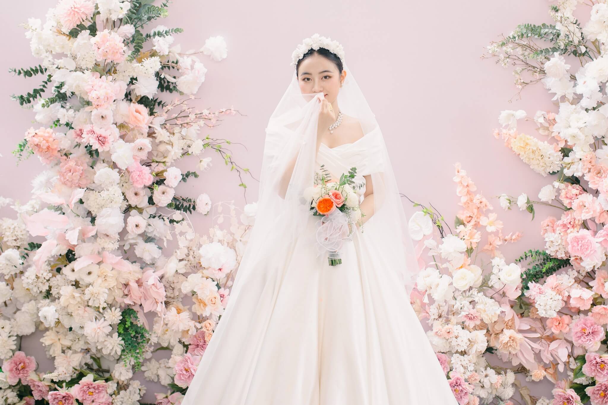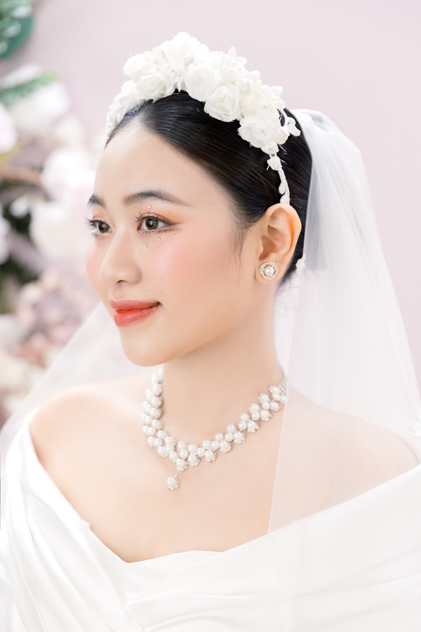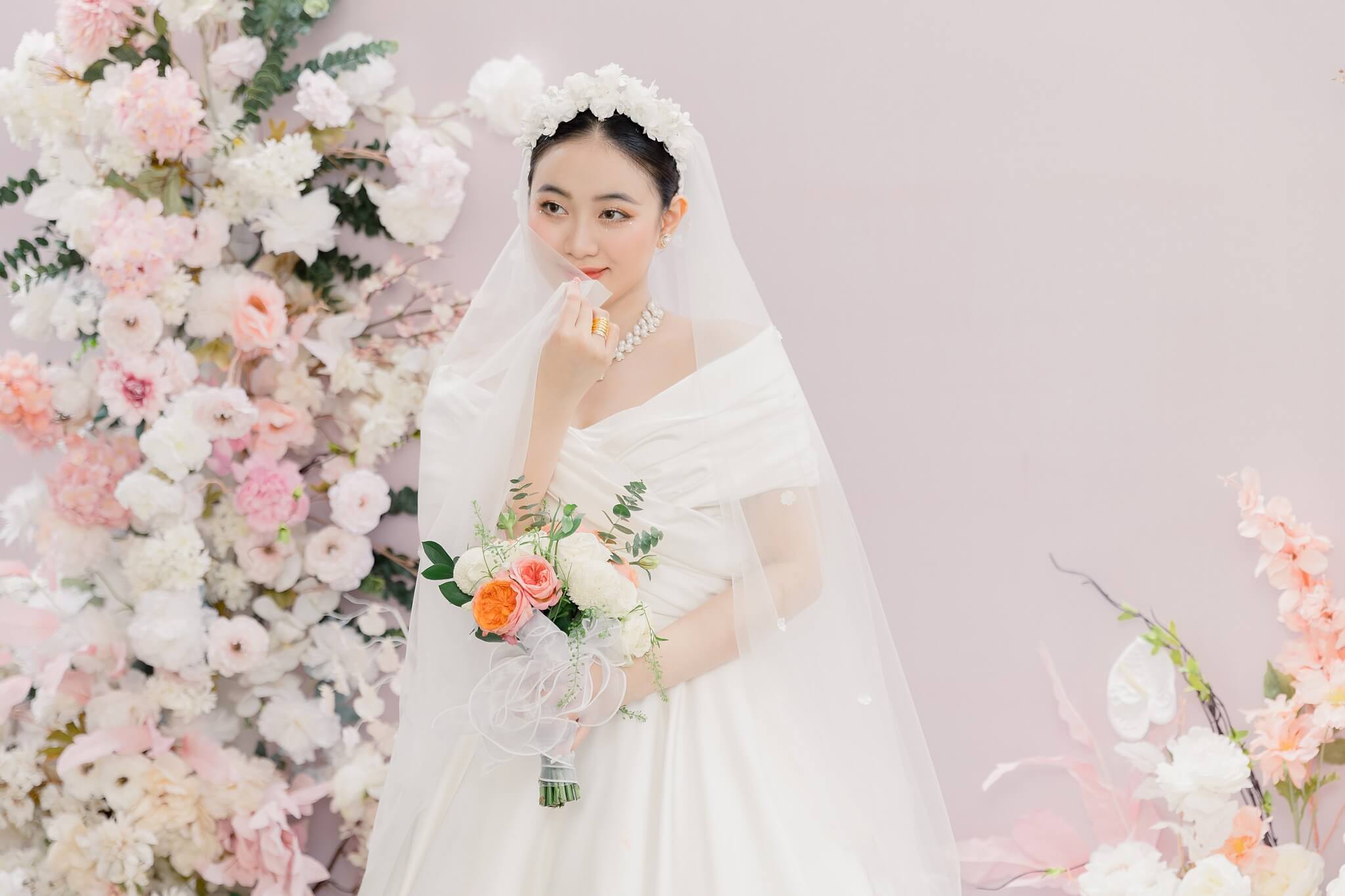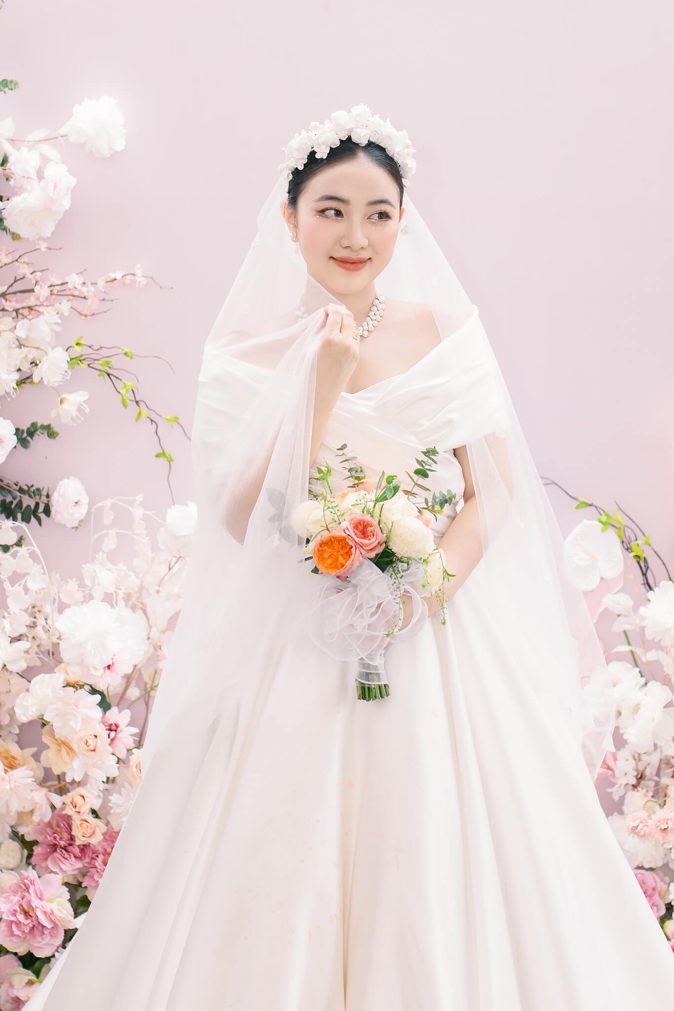 Chất liệu satin mikado cao cấp giúp phom váy đứng dáng, lên hình đẹp ở mọi góc máy. Khi kết hợp cùng khăn voan nhẹ và vương miện hoa ngọc, tổng thể toát lên sự thuần khiết và trong trẻo: một vẻ đẹp không tuổi, không lỗi thời.