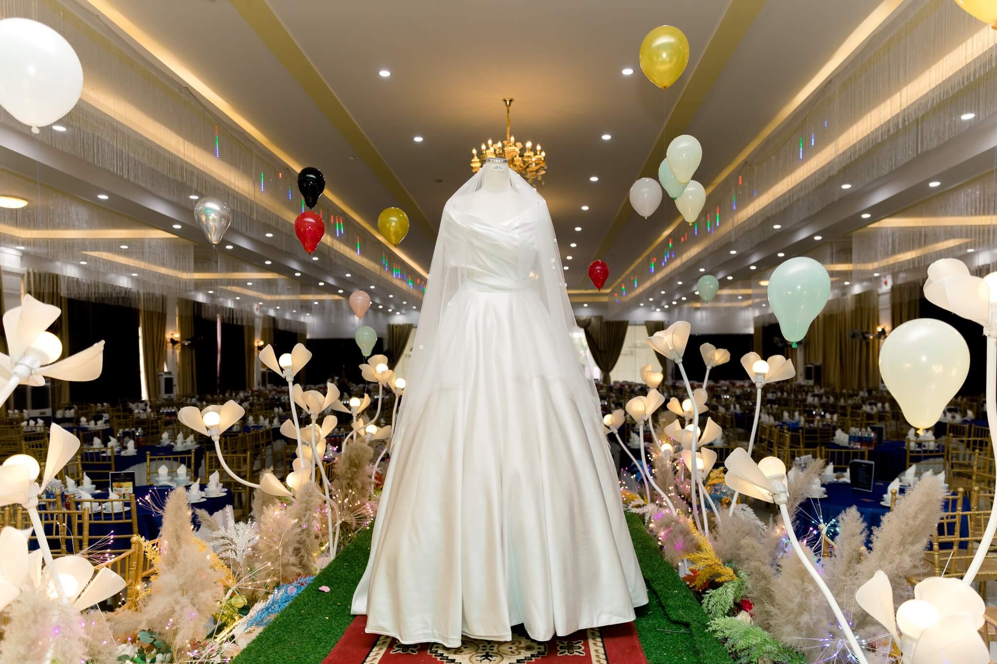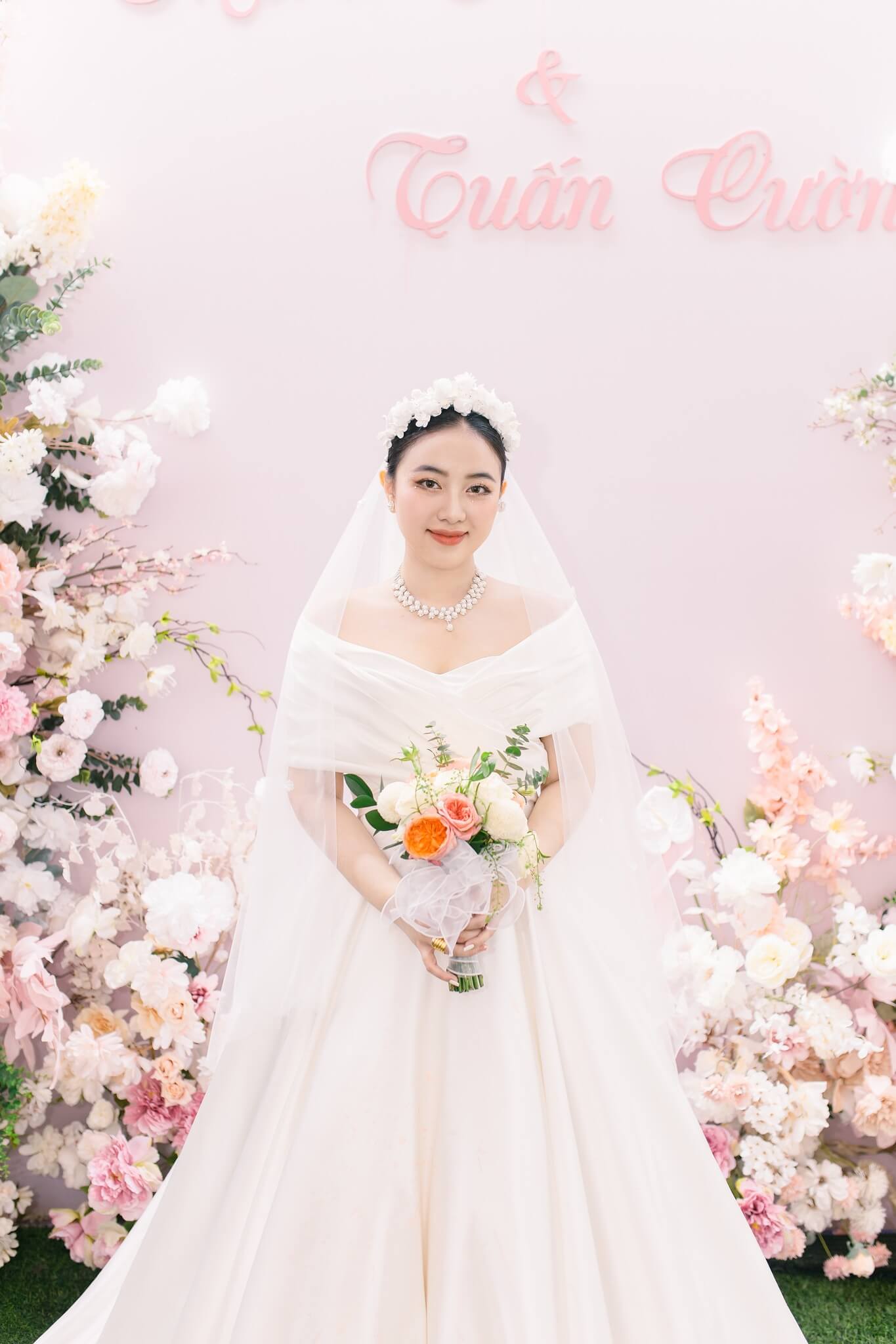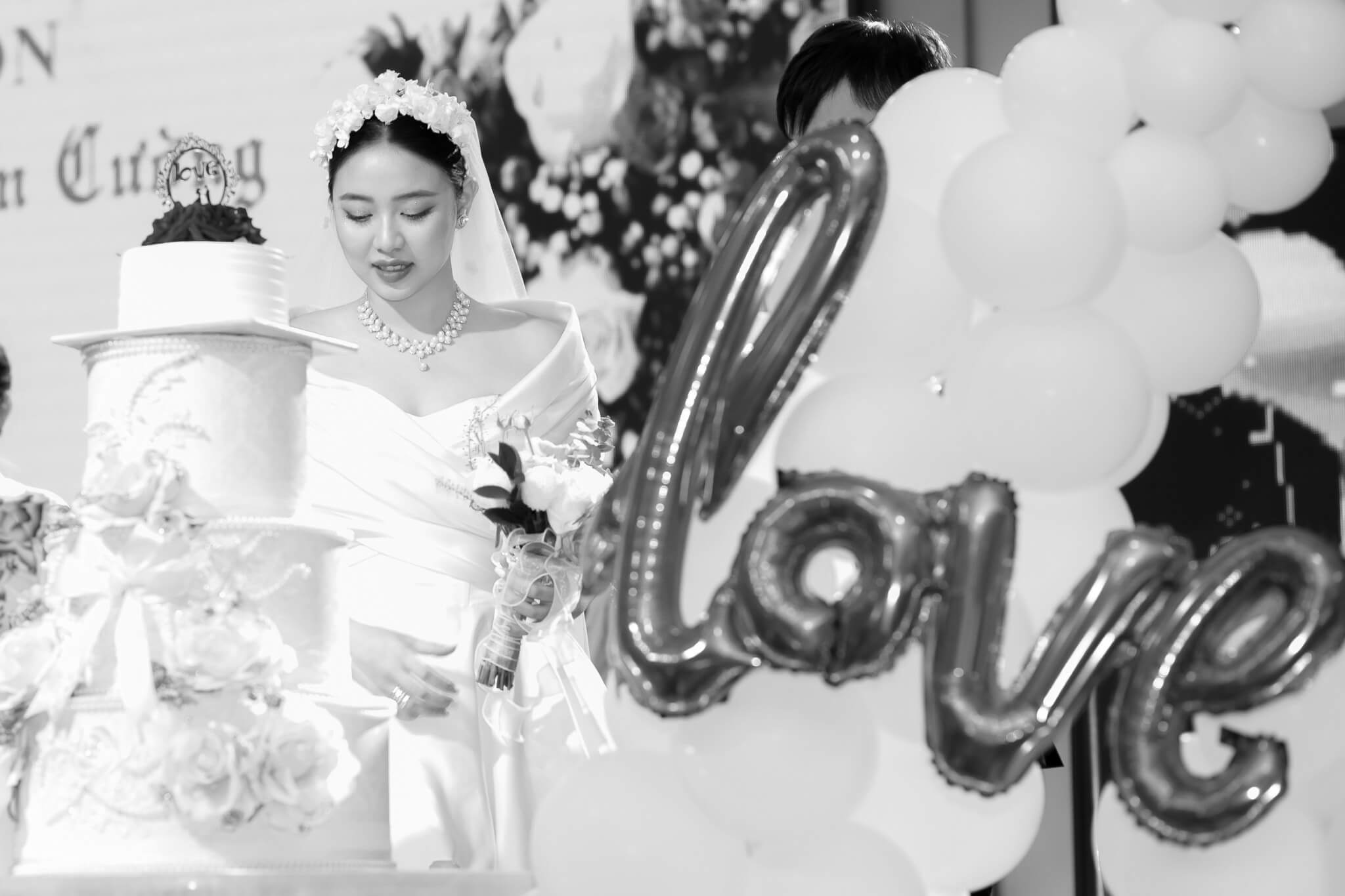 Không gian lễ cưới của Minh Anh ngập tràn hoa tươi sắc pastel, nhẹ nhàng mà rực rỡ, cũng giống như nụ cười ngọt ngào của cô dâu trong ngày trọng đại. Và chính chiếc váy ấy, giữa ngàn ánh đèn lung linh, như một “khoảnh khắc lặng” dịu dàng giữa bản giao hưởng yêu thương.