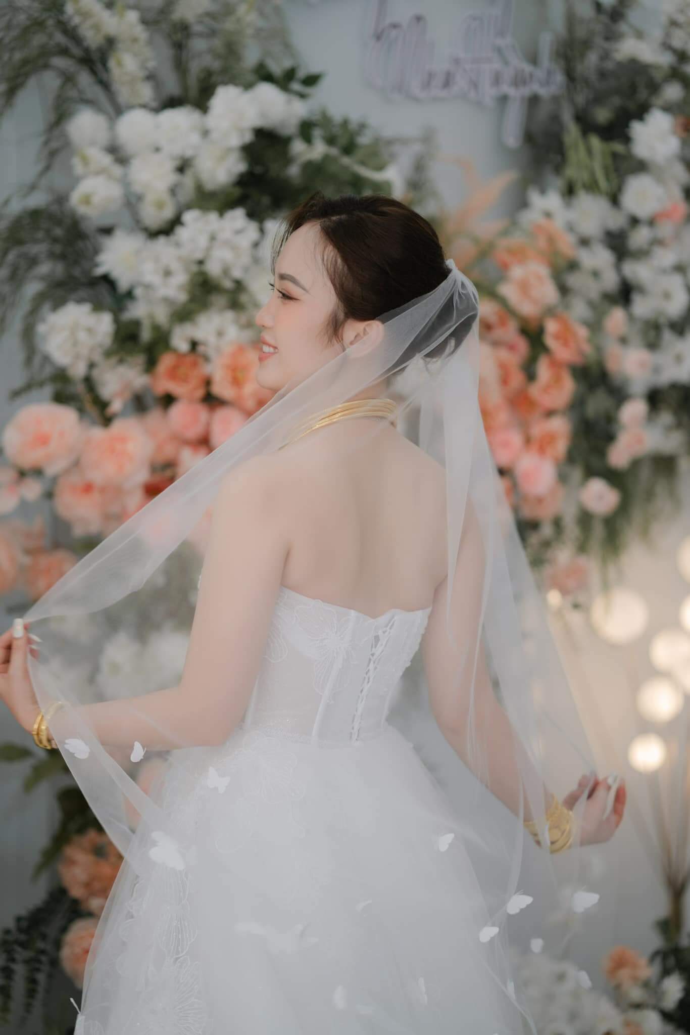 Bên cạnh váy cưới công chúa Alina, nàng dâu của chúng mình còn diện áo cưới cúp ngực Ladona cho nghi thức đón khách đầu tiệc. Với thiết kế nhẹ nhàng đầy ngọt ngào, nàng dâu càng thêm thoải mái, tự tin và sẵn sàng cho những nghi thức quan trọng nhất của buổi tiệc.