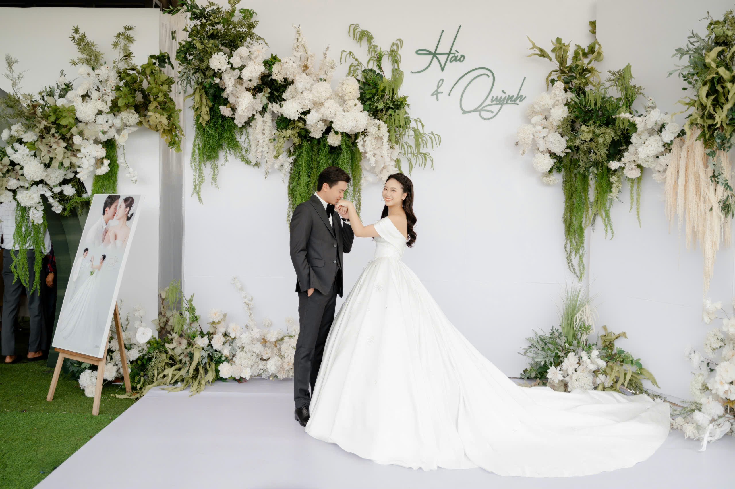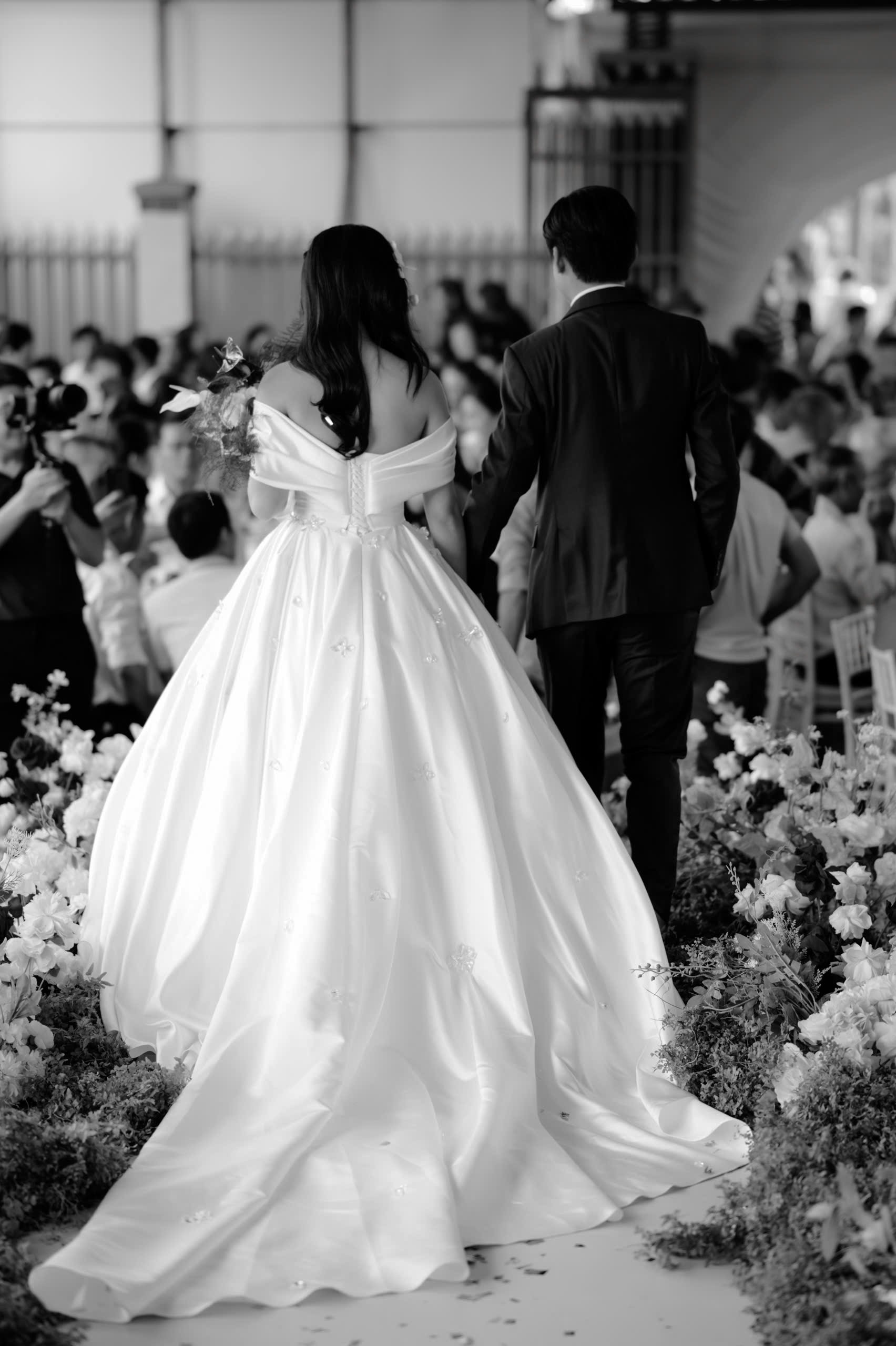 Chiếc váy cưới công chúa được Nicole Bridal thiết kế riêng cho cô dâu Như Quỳnh là mảnh ghép trọn vẹn của một đám cưới cổ tích giữa đời thực. Phom váy xòe bồng kinh điển mang đến vẻ đẹp lộng lẫy nhưng không phô trương, khéo léo tôn lên vóc dáng thanh thoát và thần thái dịu dàng của nàng dâu trong khoảnh khắc bước vào lễ đường.