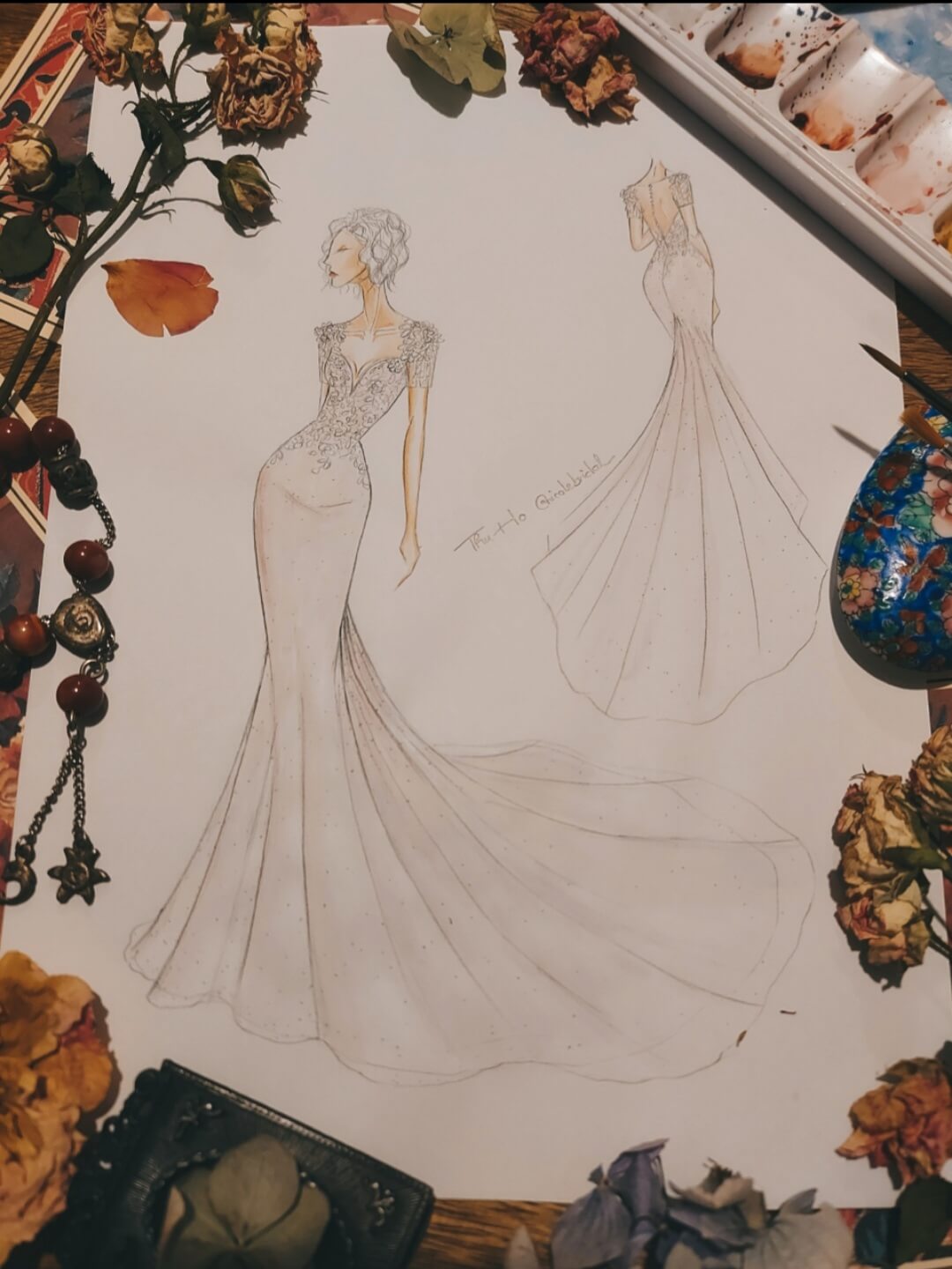 Thiết kế váy cưới đuôi cá vốn đã là biểu tượng của sự quyến rũ. Từng đường cắt của thiết kế hứa hẹn “ôm sát” cơ thể, làm nổi bật những đường cong mềm mại, để mỗi bước đi của nàng dâu trở nên duyên dáng và tự tin hơn bao giờ hết. Nhưng điều khiến váy cưới của Thu Hồ trở nên đặc biệt chính là sự tỉ mỉ trong từng chi tiết ren. Những bông hoa ren nhỏ nhắn, những hạt ngọc trai lấp lánh được đính thủ công đã tạo nên bức tranh tinh xảo, khiến chiếc váy không chỉ đẹp ở tổng thể mà còn đẹp trong từng khoảnh khắc nhìn gần.