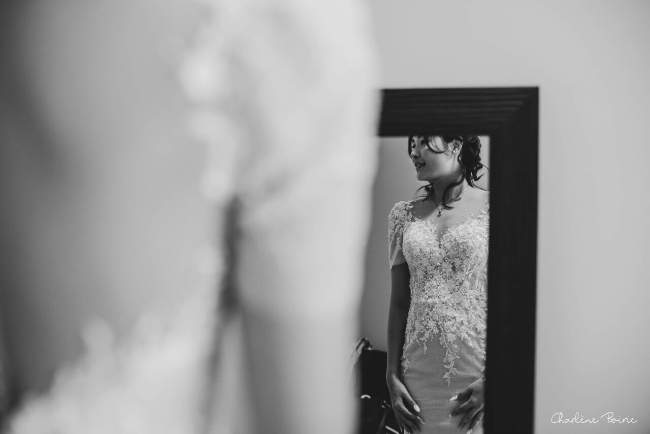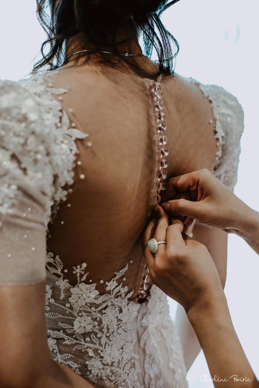 Trong ngày hạnh phúc, khi hàng cúc ngọc trai nhỏ được cài khéo léo sau lưng, nàng dâu Thu Hồ đã thực sự toả sáng. Ánh nhìn rạng rỡ, nụ cười tràn đầy hạnh phúc và dáng vẻ tự tin khiến chiếc váy không chỉ là một trang phục cưới, mà còn trở thành minh chứng cho khoảnh khắc thiêng liêng và tình yêu trọn vẹn.
