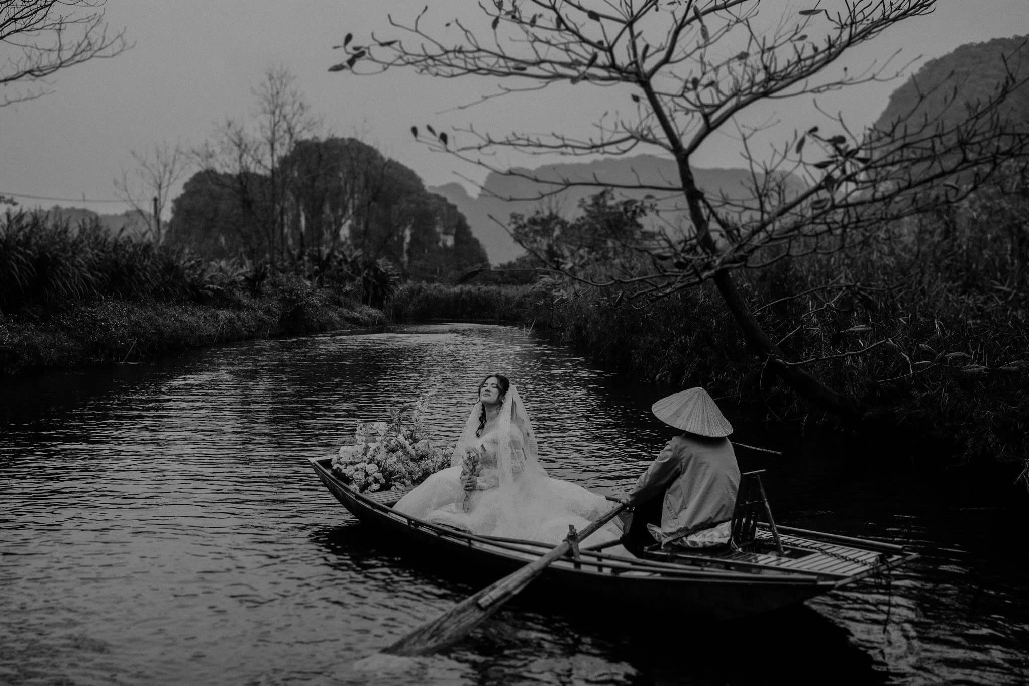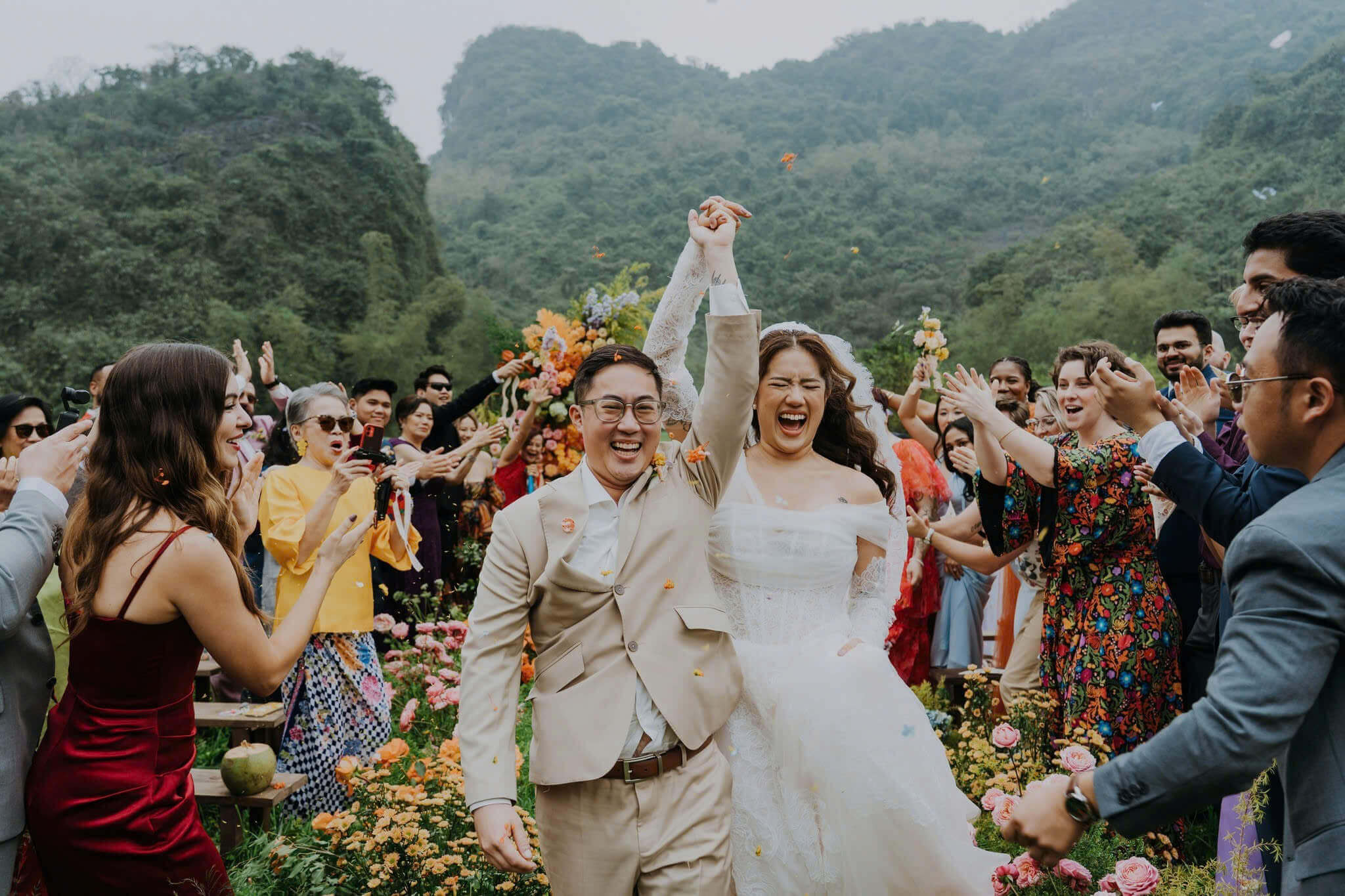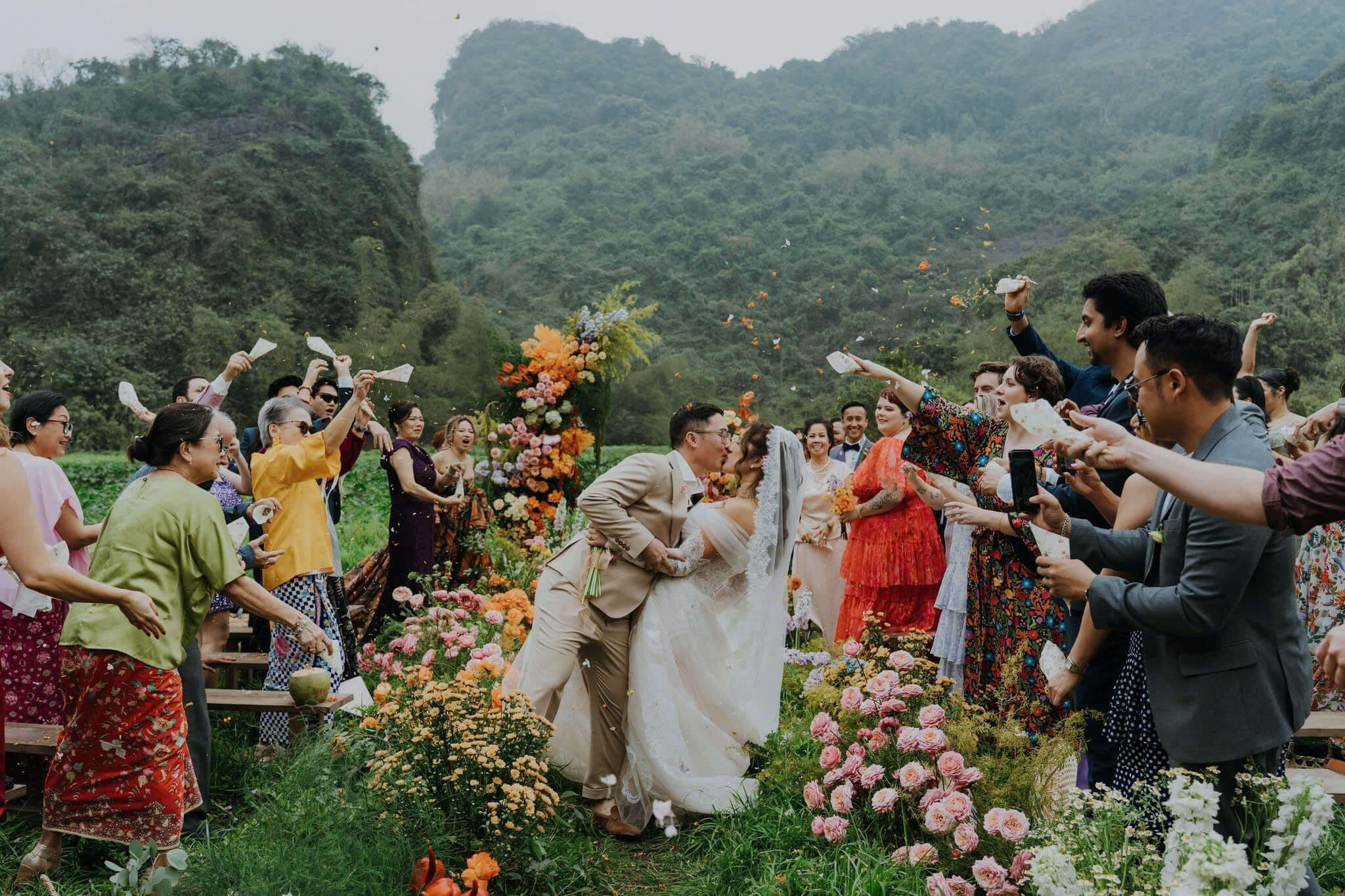 Giữa khung cảnh hùng vĩ của núi rừng Ninh Bình, với thung lũng xanh mướt và dòng sông uốn lượn, Catherine và Johnny đã chọn elopement, một lễ cưới nhỏ gọn nhưng đầy tình cảm. Ngày hôm ấy, khi ánh nắng buổi sớm len qua rặng núi, không gian trở nên thiêng liêng hơn bao giờ hết. Bạn bè và gia đình thân thiết quây quần, chứng kiến đôi trẻ trao nhau lời thề nguyện. Không pháo hoa rực rỡ, không sân khấu xa hoa, chỉ có tiếng cười, những cánh hoa nhiệt đới cùng trái tim yêu thương dành trọn cho nhau.
