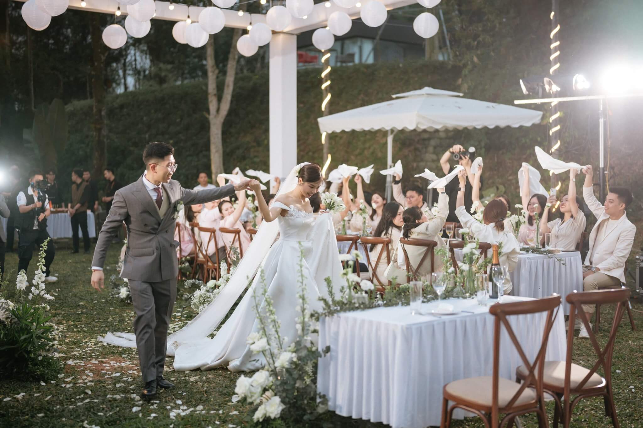 In an open-air setting filled with greenery and natural light, Hà An appeared radiant in her custom-made wedding gown from Nicole Bridal. The off-shoulder design with delicate floral accents across the neckline, crafted from luxurious satin, brought out an air of absolute elegance.