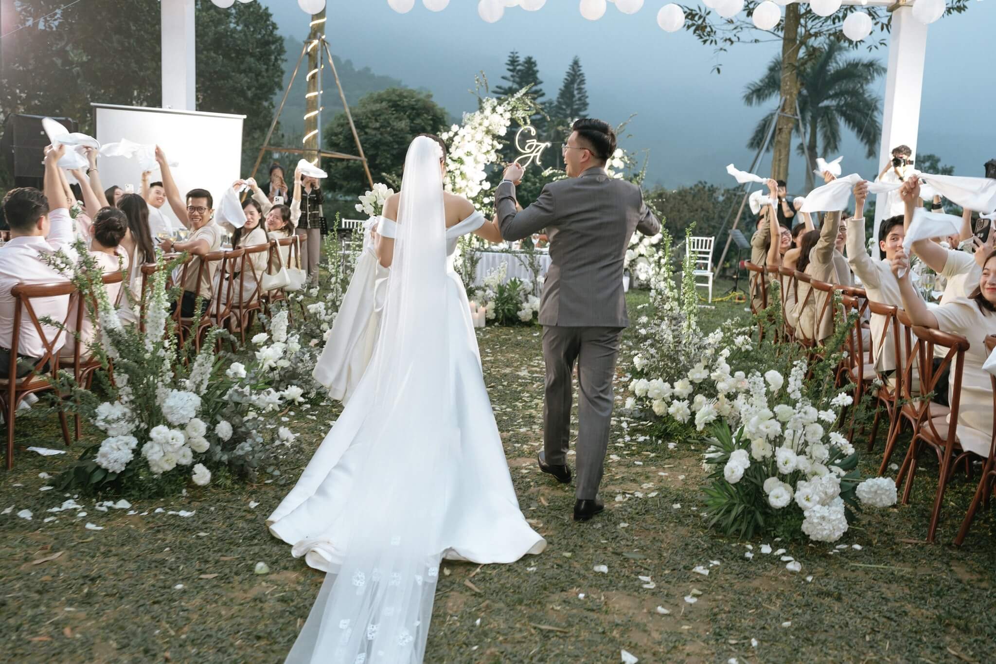 Beyond the gown, Hà An chose a personalized veil – embroidered with intricate details and the couple’s wedding date, turning it into a cherished keepsake of their love story. Every step she took along the floral aisle, surrounded by the blessings of family and friends, became a testament to completeness: a love fulfilled and a bridal image both graceful and unforgettable.