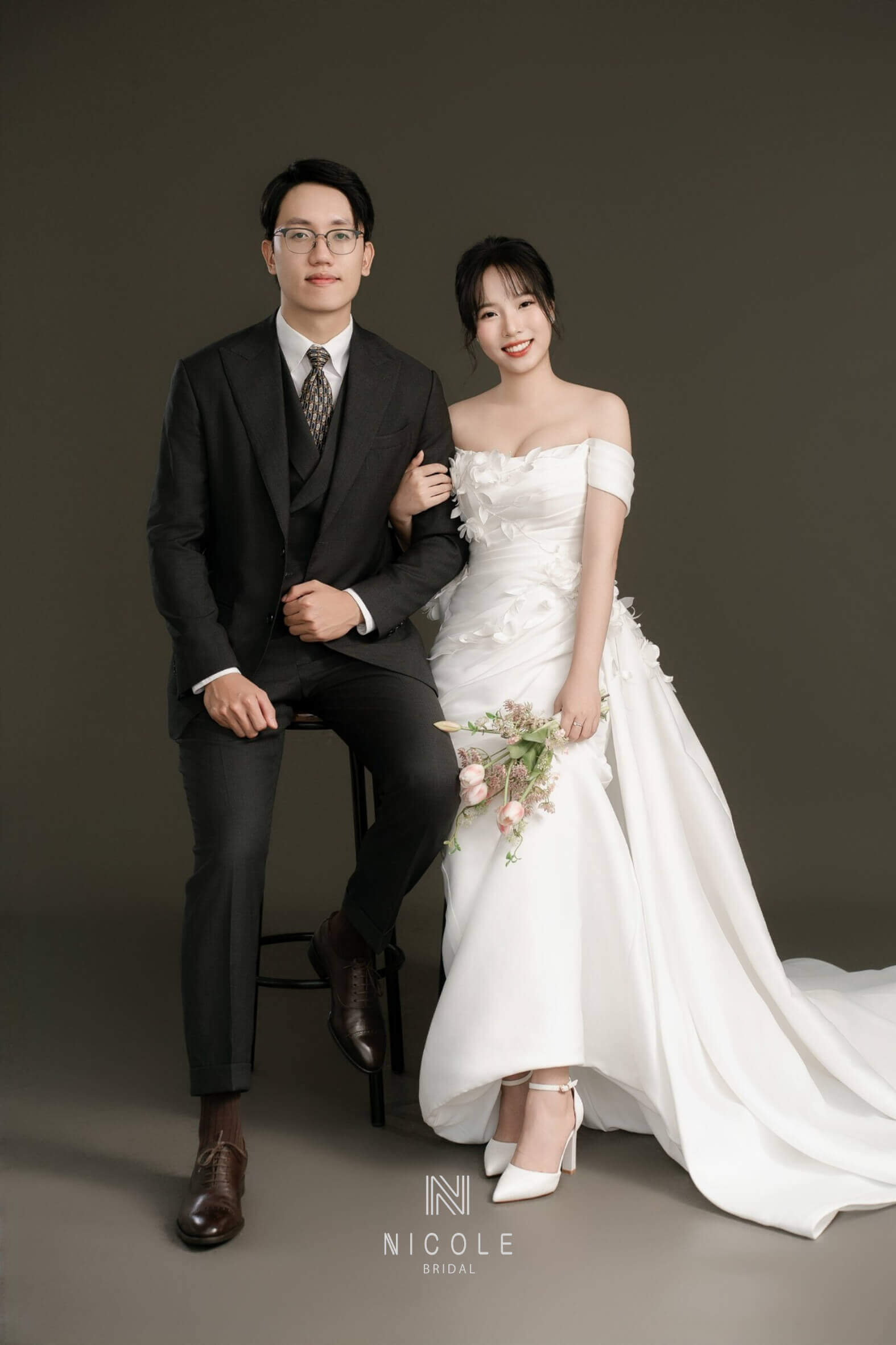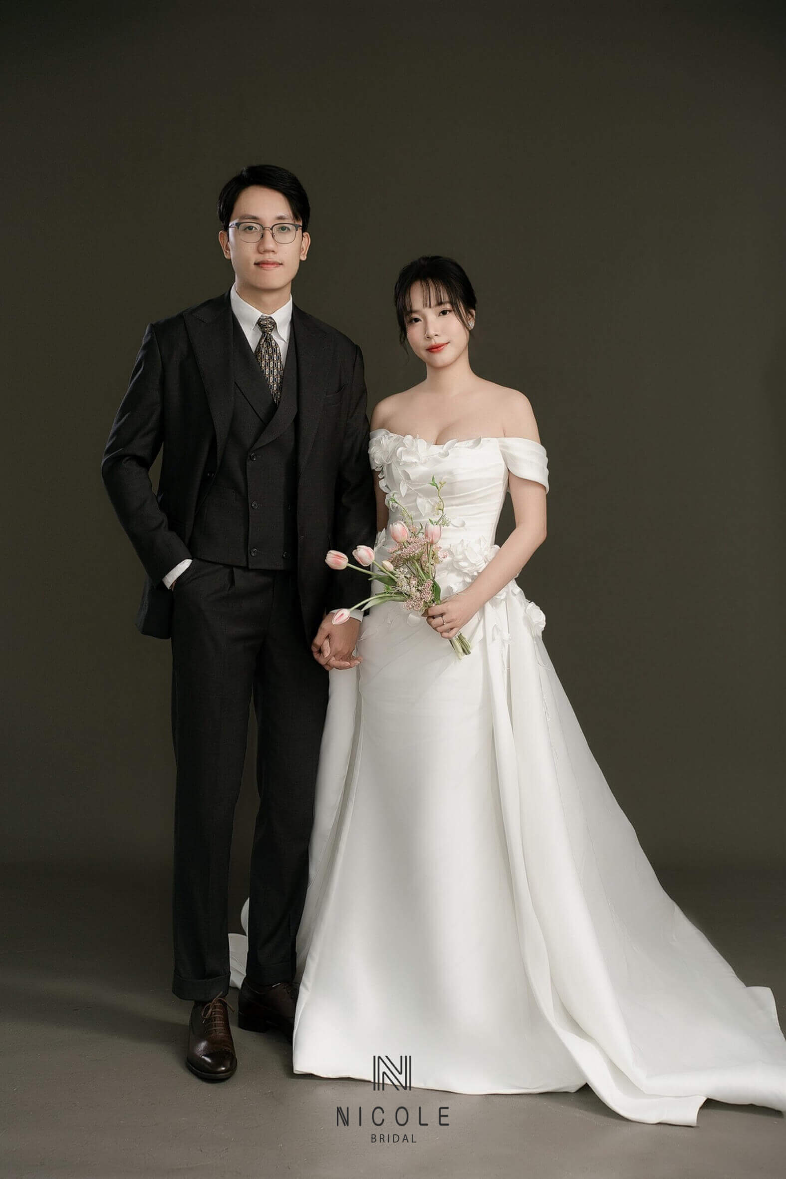Bride Hong Khanh chose a delicate 2-in-1 wedding gown that perfectly embodies femininity and elegance. With its off-the-shoulder silhouette and soft floral appliqués, the gown exudes romantic sweetness in every detail. The detachable skirt allows her to effortlessly transform her look, from graceful sophistication during the ceremony to a lighter, more comfortable style for the celebration.