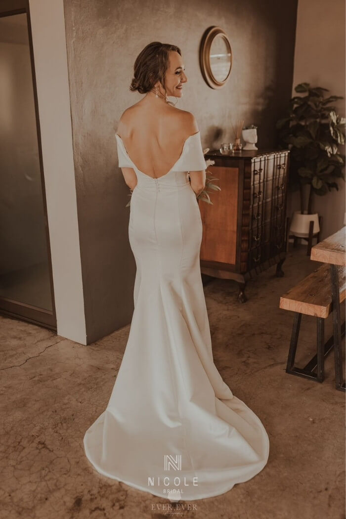 Julia chose to wear a minimalist silk wedding gown – a design that is both elegant and modern for her special day. The off-shoulder detail gently accentuated her delicate shoulders, while the cross-draped bodice added a touch of softness and refinement. At the back, the open design brought a bold yet graceful charm, making Julia the center of every gaze.