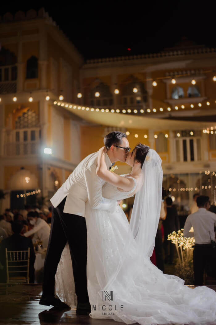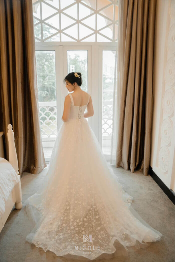 The first look moment of bride Tiên Đỗ became an unforgettable highlight of her wedding day. She chose to order her wedding dress online from Nicole Bridal, yet when she put it on, the gown fit perfectly – as if it had been made just for her, enhancing her graceful charm and radiant smile.