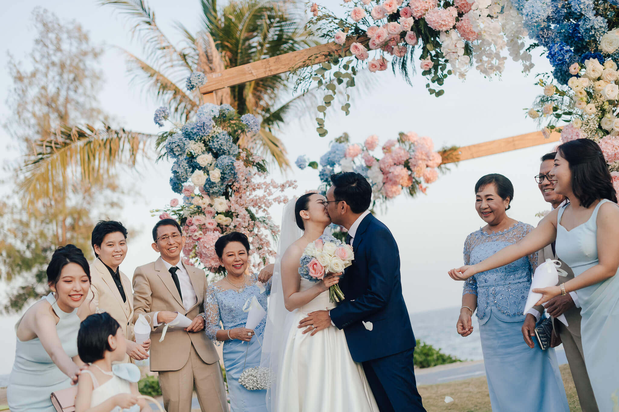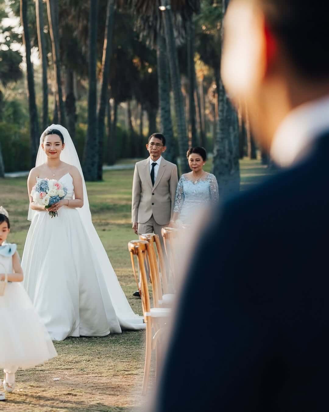 Dưới ánh nắng vàng dịu nhẹ của buổi chiều hôm ấy, nàng dâu Emerald đến từ Thái Lan của chúng mình xuất hiện thật ngọt ngào trong chiếc váy cưới satin tối giản, được thiết kế riêng cho nghi lễ cưới ven biển. Với niềm “đam mê” với những thiết kế váy cưới tối giản hiện đại và sang trọng, ngay từ buổi trao đổi đầu tiên, cô dâu Emerald kiên định lựa chọn váy cưới chất liệu mikado silk thanh lịch. Thiết kế không có bất kỳ chi tiết đính kết nào, bởi điểm nhấn nơ to bản phía trước ngực là điểm đặc biệt của chiếc váy, như thay lời muốn nói về vẻ đẹp dịu dàng và đáng yêu của nàng dâu. Một chiếc váy cưới thiết kế, không cầu kỳ, nhưng đầy đủ cảm xúc để nâng đỡ từng bước nàng chuyển động, từng ánh nhìn của Emerald trong khoảnh khắc thiêng liêng nhất đời người.