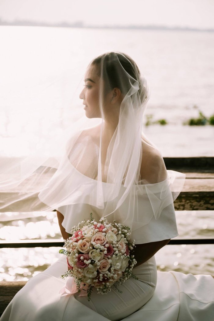 Nhi Anh chose a minimalist mermaid tail wedding dress to create a romantic pre-wedding photoshoot by the Saigon River. The delicate yet exquisite design helps