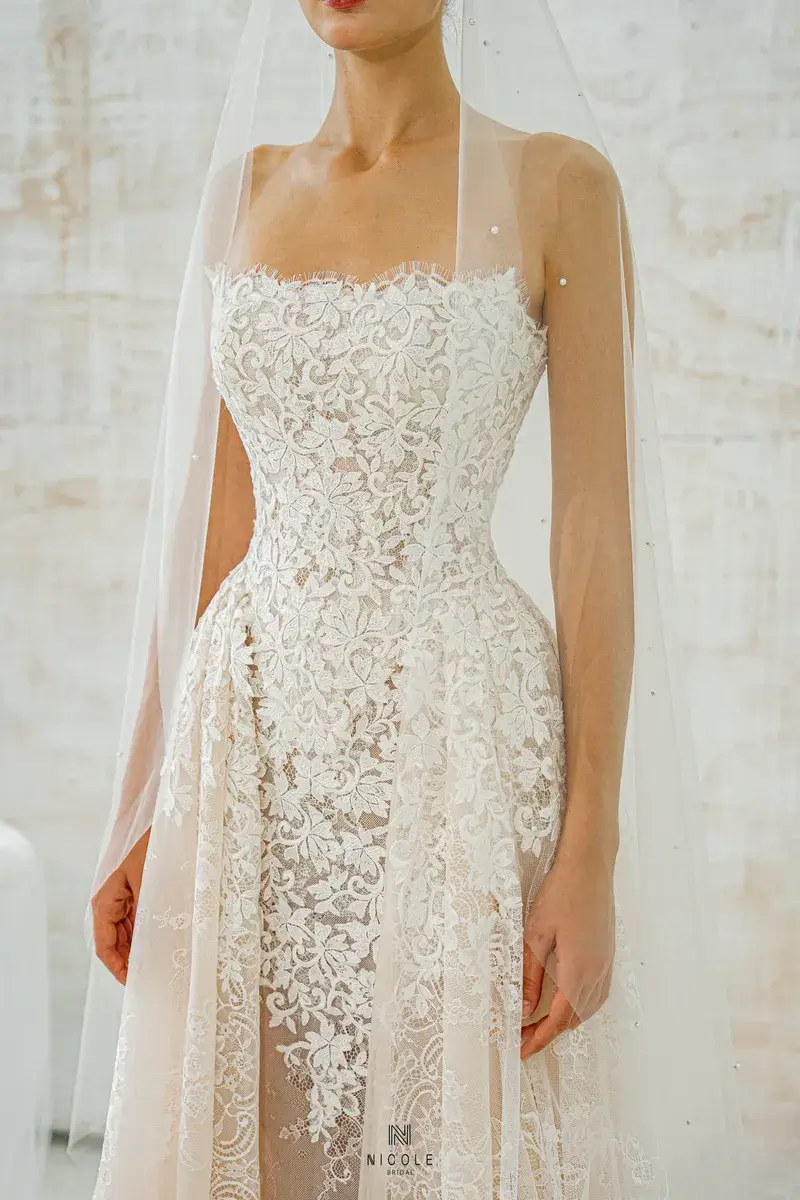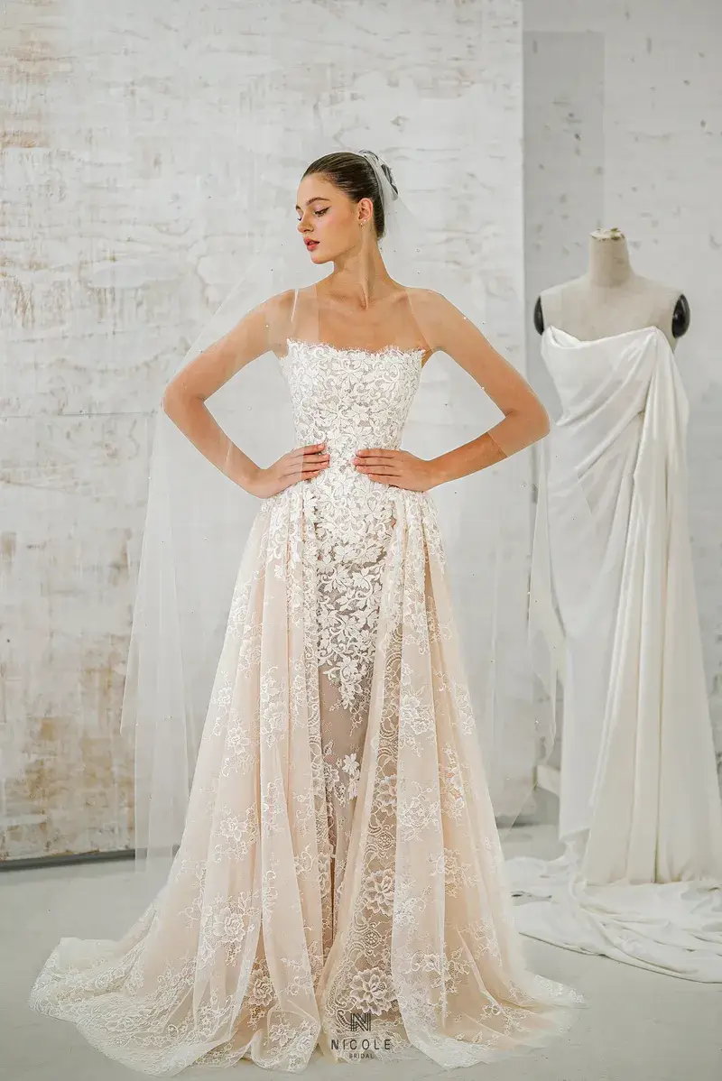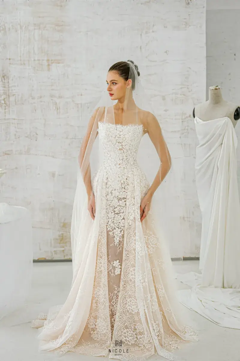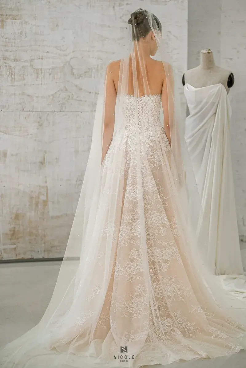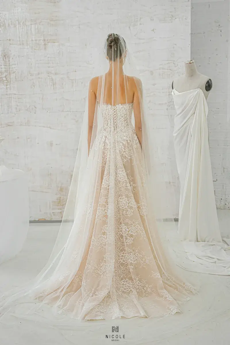 Beginning the big day with a classic-inspired wedding gown, Aurelia promises to leave every guest in awe of the bride’s beauty. Its unique champagne hue pairs with exquisite lace detailing across the bodice and the graceful long train, creating an elegant and captivating look. The Aurelia lace wedding gown is a special gift Nicole Bridal has crafted especially for autumn brides.