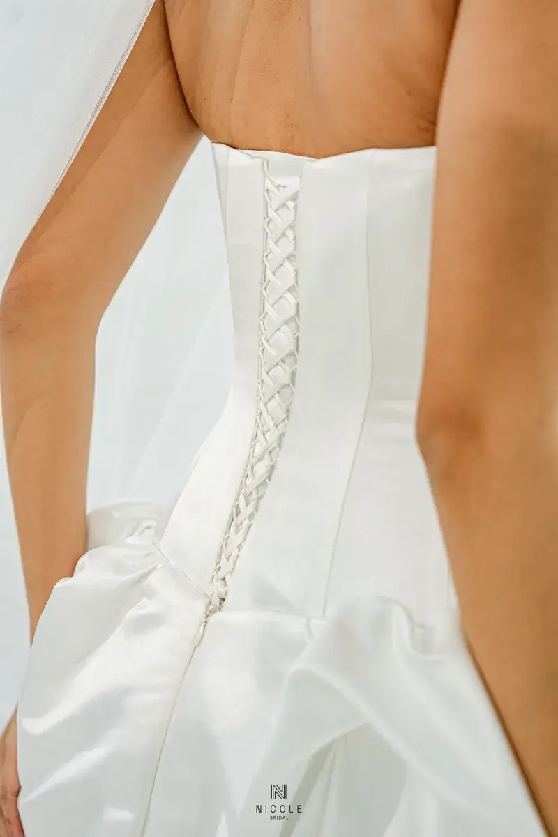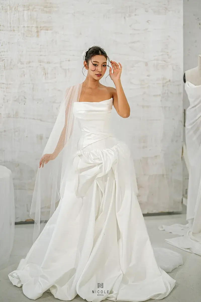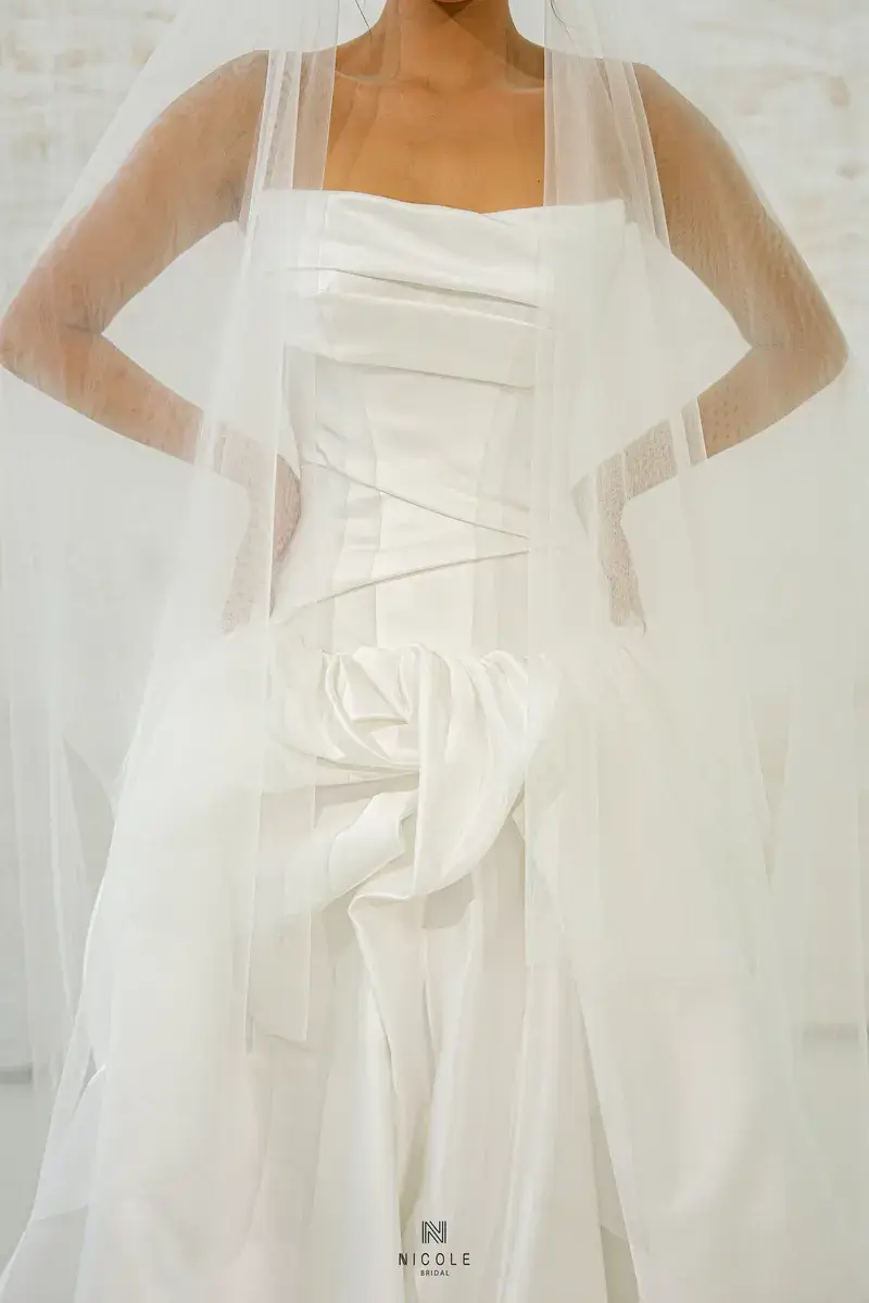 A gentle symphony of femininity, Cassandra is created from white satin and the masterful draping techniques of Nicole Bridal’s experienced tailors. The busty design and eye-catching ruffled effect of the super-lady Cassandra low-waist wedding dress will help you become special in every moment.