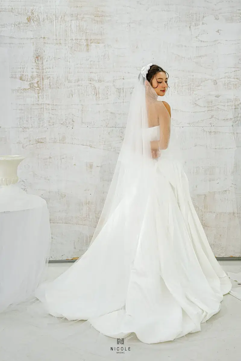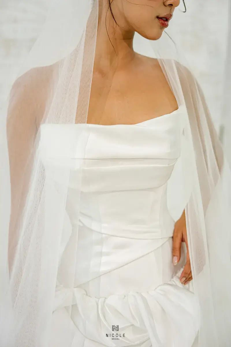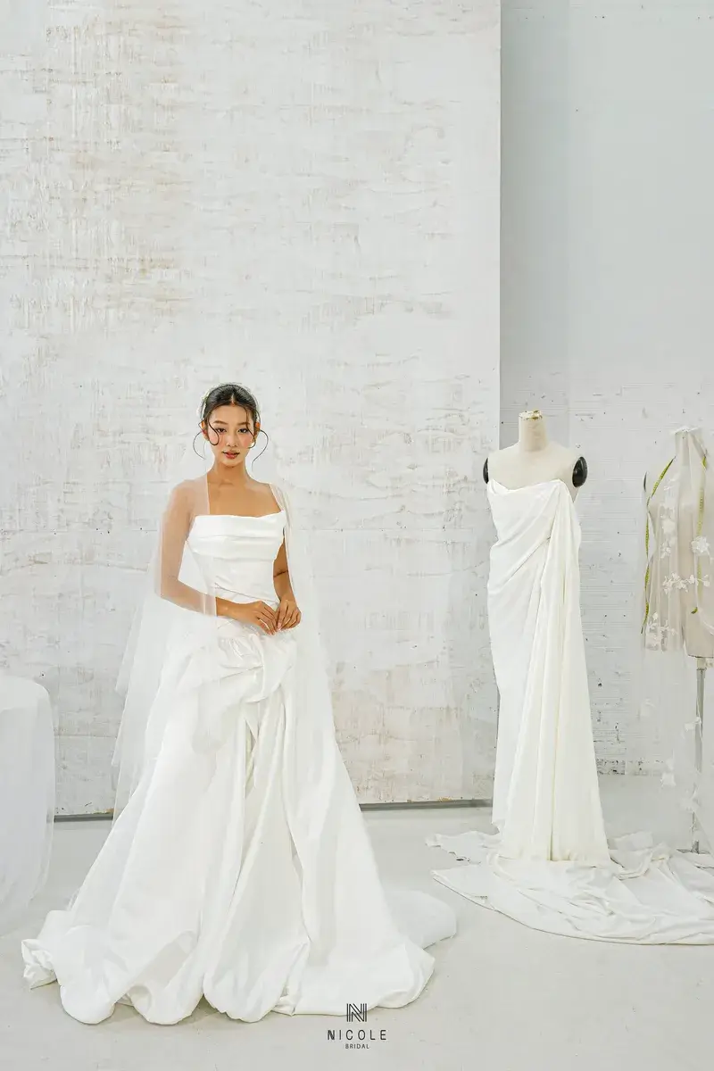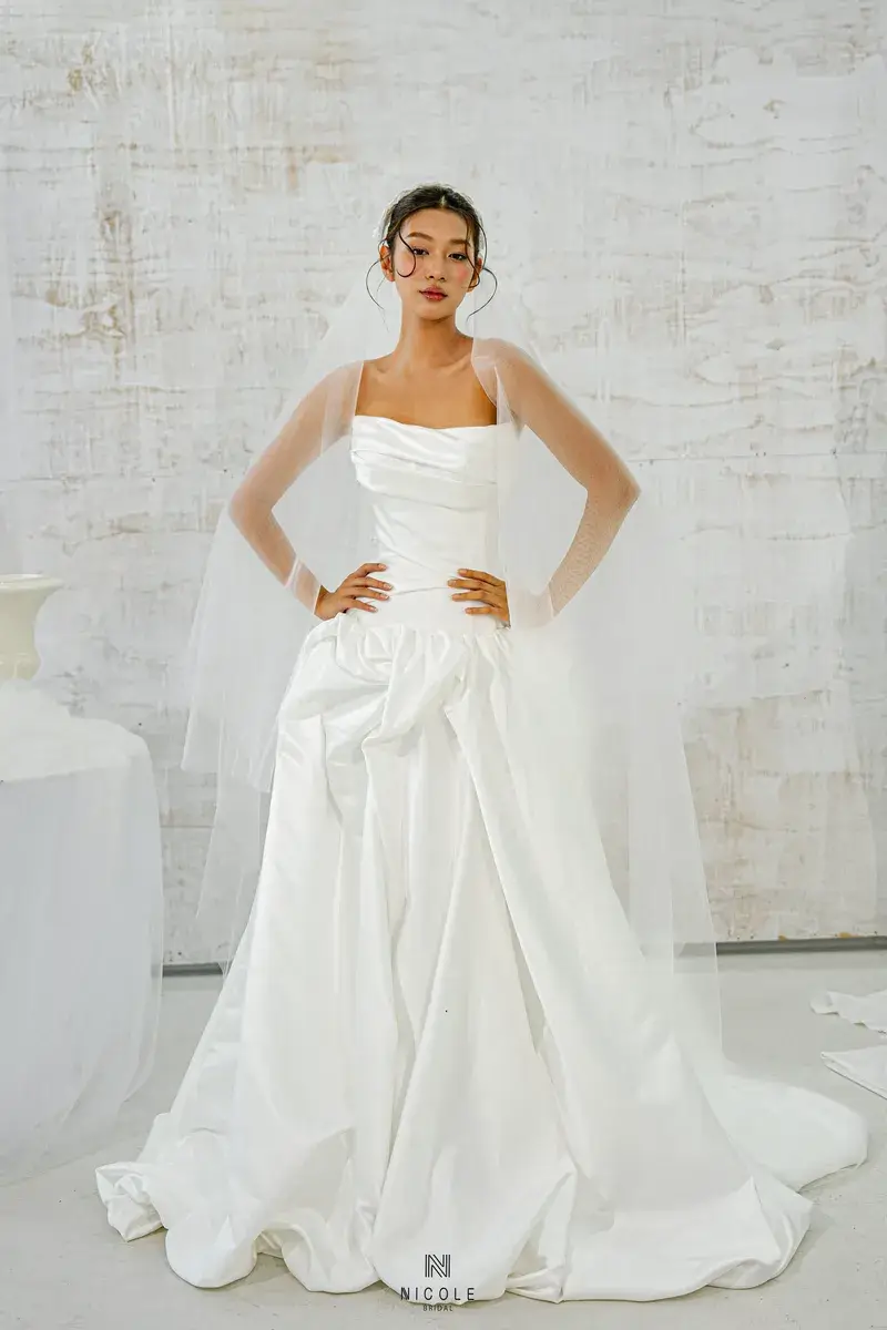 A gentle symphony of femininity, Cassandra is created from white satin and the masterful draping techniques of Nicole Bridal’s experienced tailors. The busty design and eye-catching ruffled effect of the super-lady Cassandra low-waist wedding dress will help you become special in every moment.