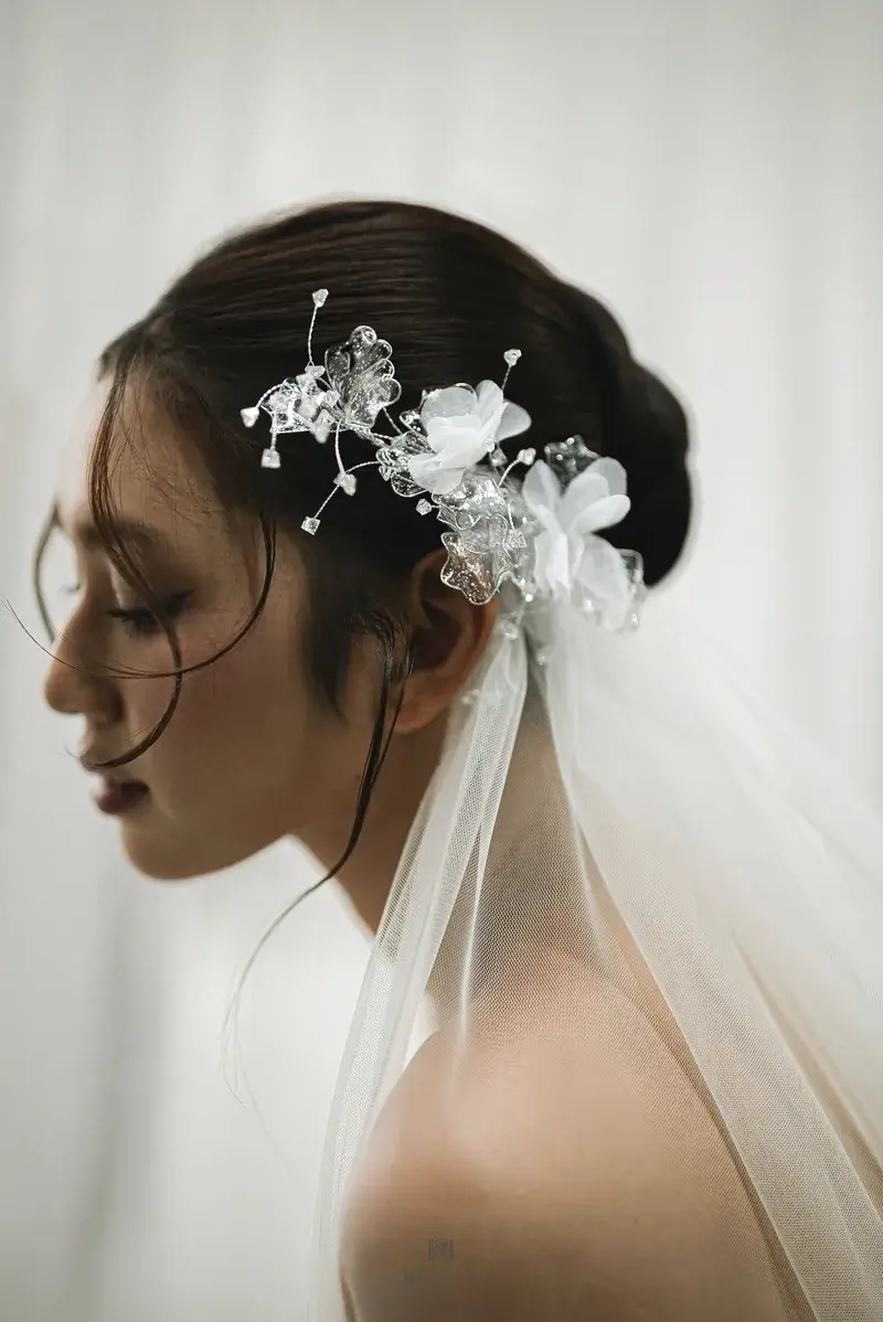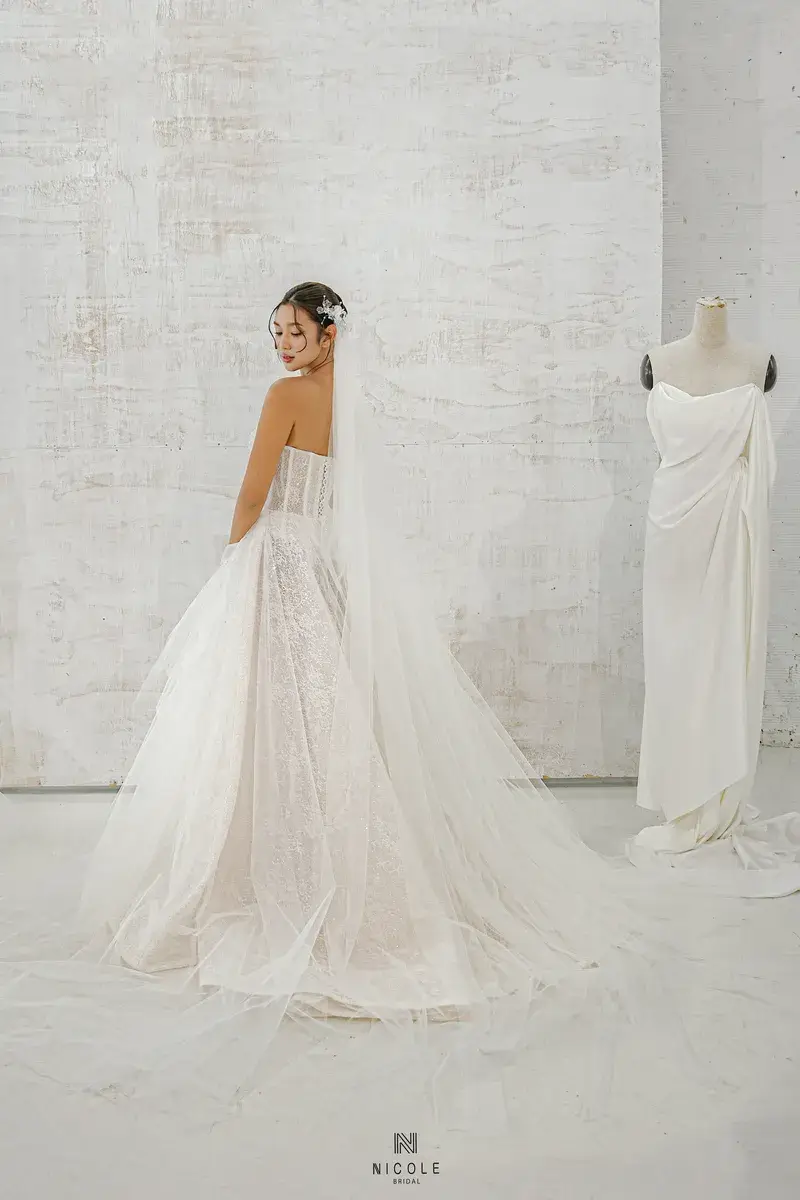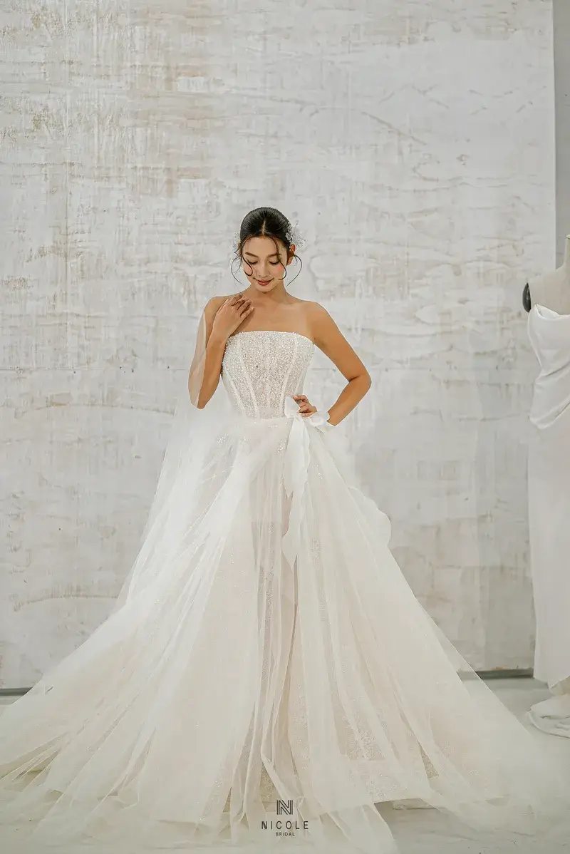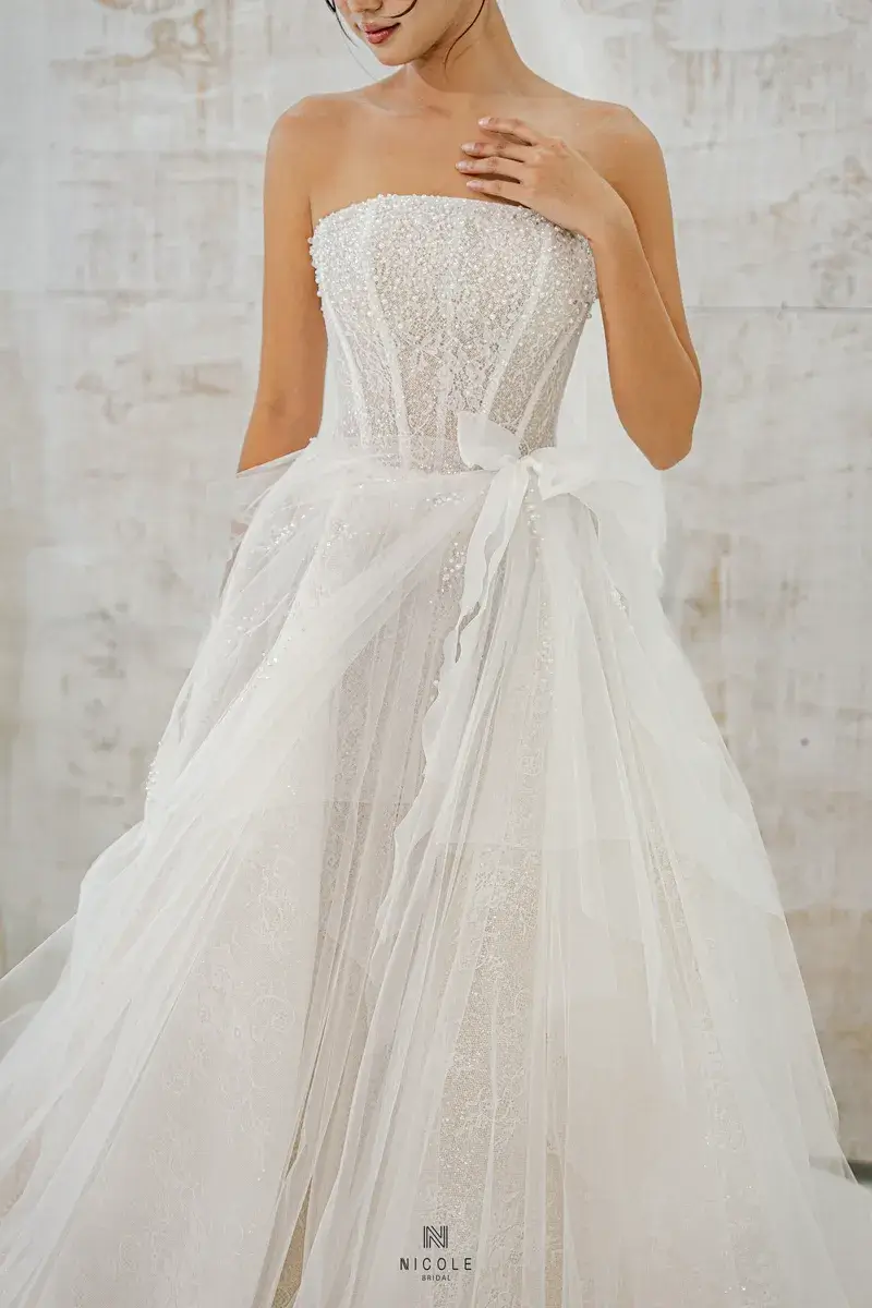 With its ultra-light structure, voluminous silhouette, and feminine-enhancing shape, the Cina strapless gown brings a sweet, pure, and charming beauty to the bride on her special day. Layers of lace and tulle are delicately crafted and adorned with pearls and shimmering sequins, giving her a radiant yet gentle appearance—like walking through a dream.