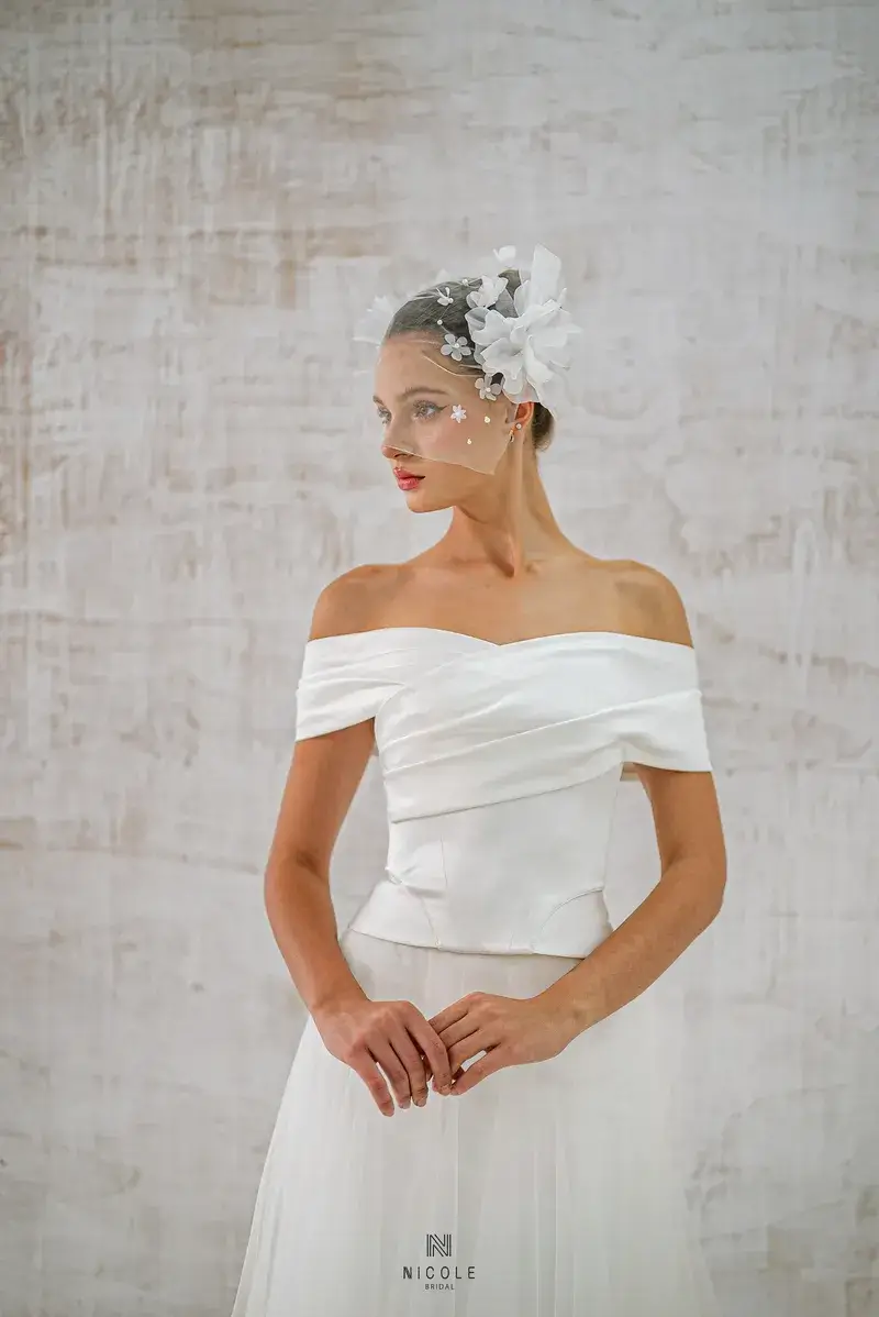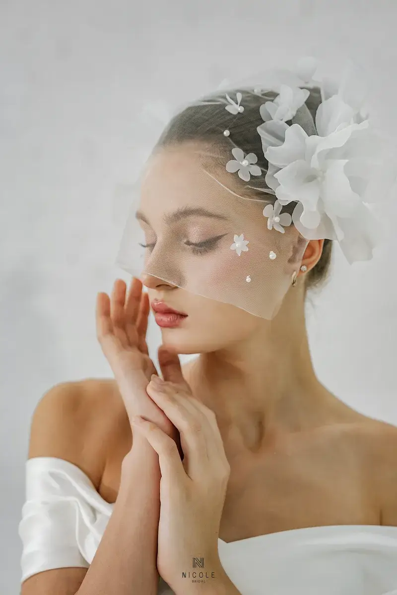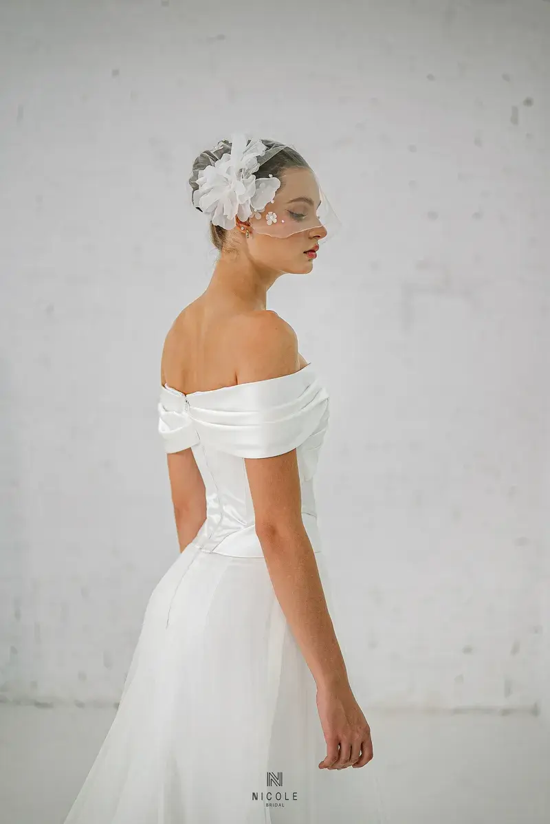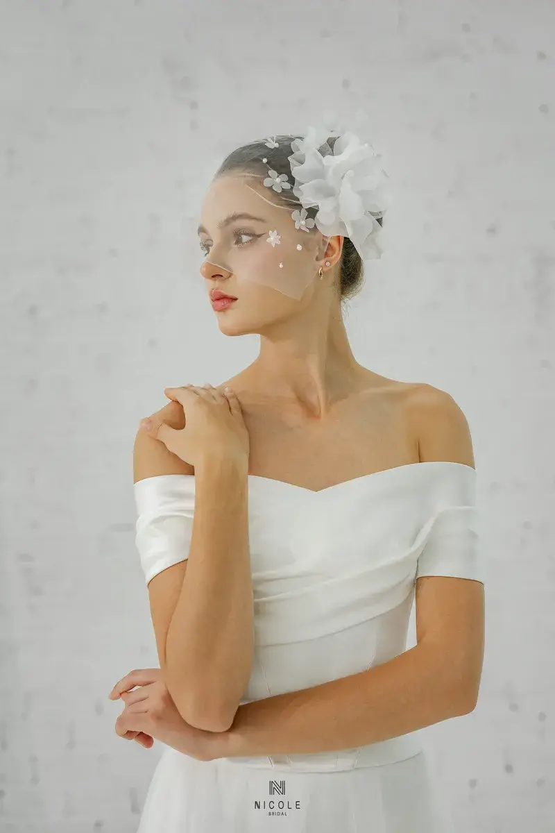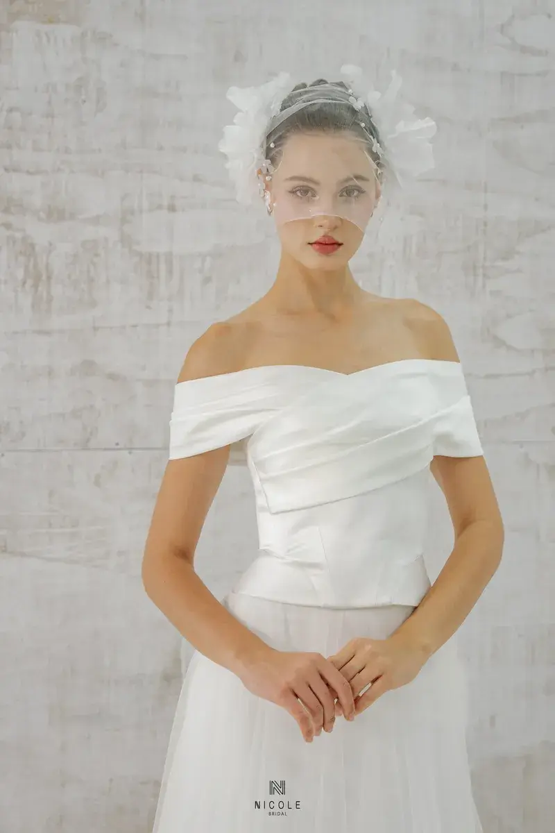 The highlight lies in the handcrafted bridal veil, meticulously created by designer Nicole Ngô and the skilled artisans of Nicole Bridal. Every flower and every layer of tulle is hand-applied, forming a look that is distinctive, delicate, and captivating—classic yet unmistakably modern. With Odile, Nicole Bridal conveys the spirit of the modern woman: confident, elegant, and always shining in her own unique way.