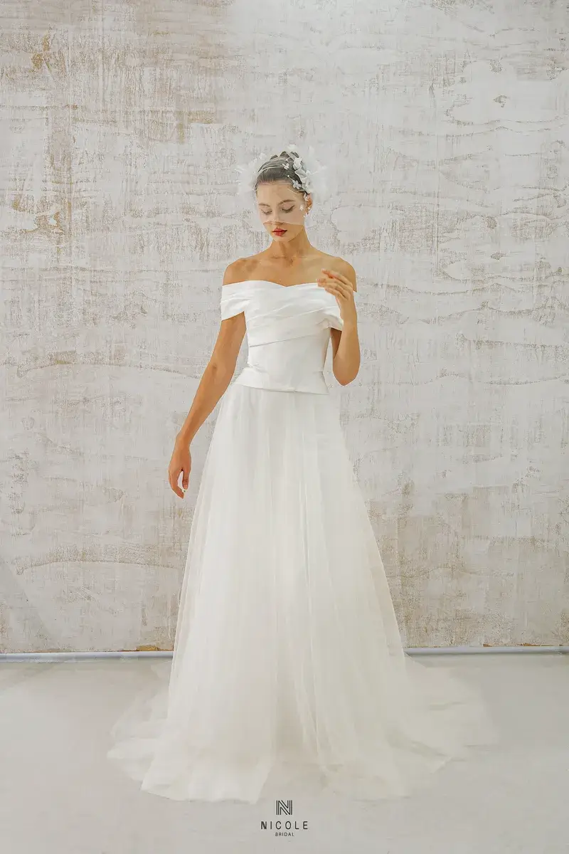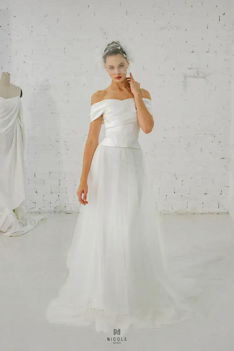 Infused with modern elegance in every detail, Odile is a unique two-piece wedding gown that offers the bride a refined, sophisticated, yet striking beauty. Its minimalist silhouette is expertly crafted to accentuate delicate curves—both modest and alluring. This is the kind of timeless beauty every bride dreams of.