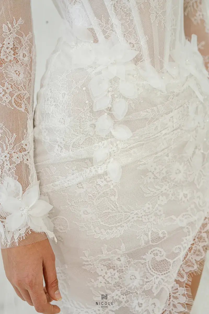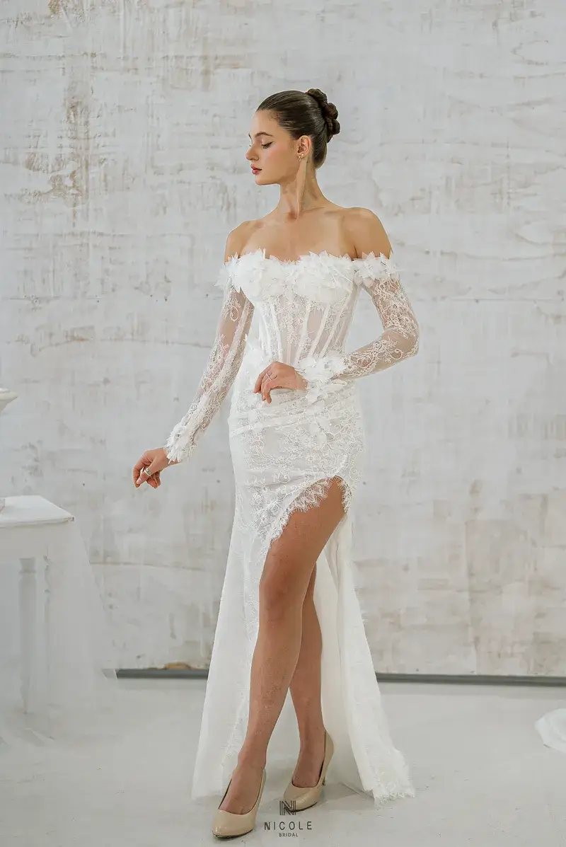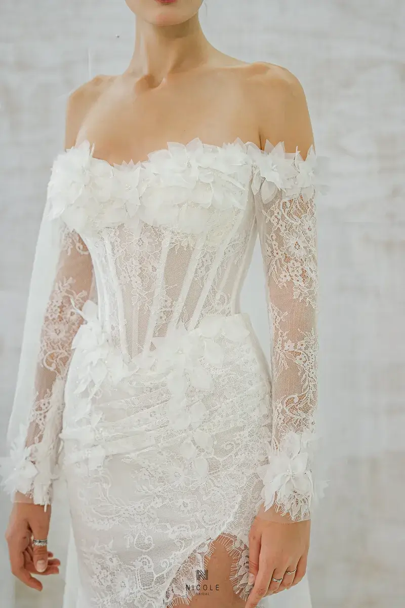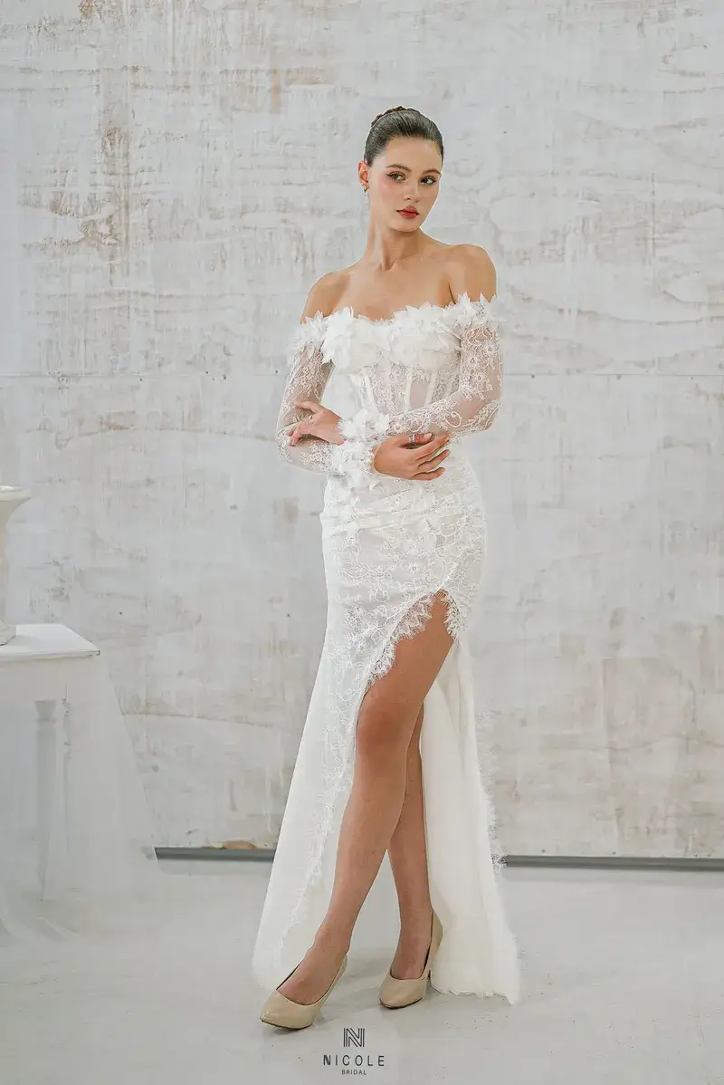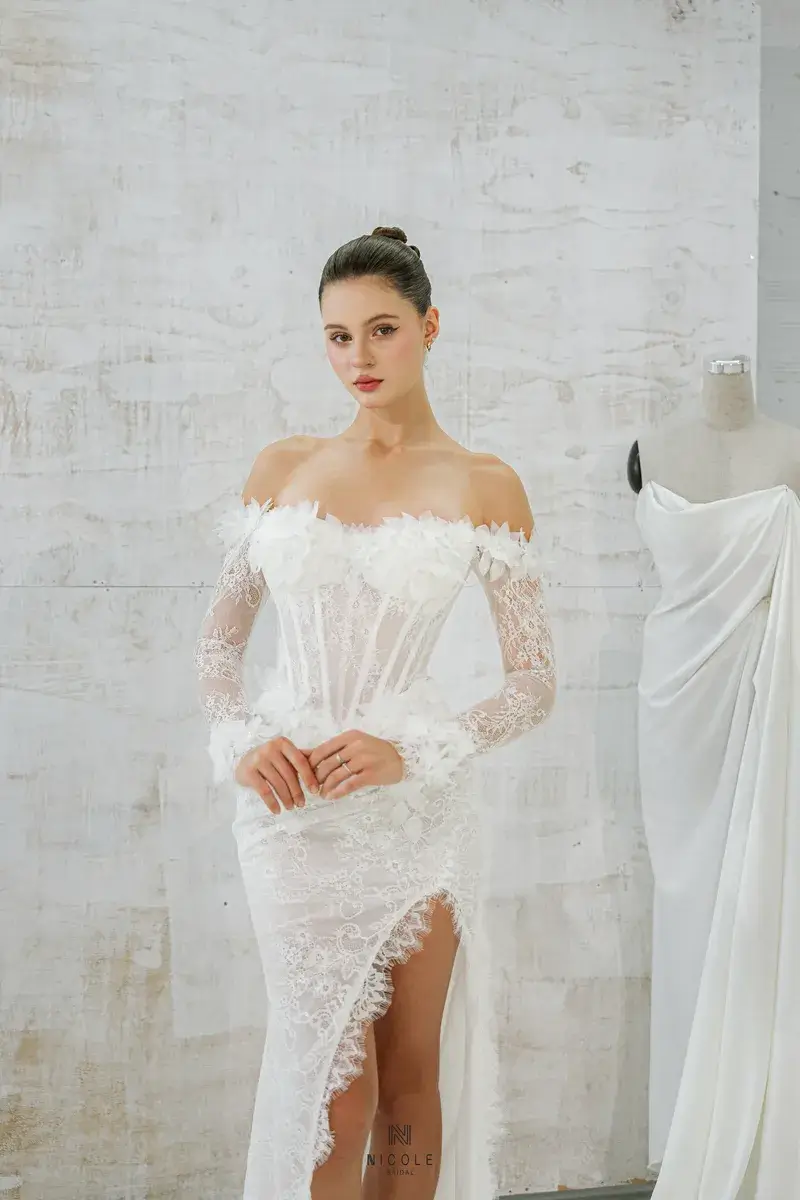 Summer may have passed, but nothing can stop a bride from glowing in floral gowns. As autumn arrives, Nicole Bridal has specially crafted an adorable 3D petite-floral dress featuring an off-shoulder design and a thigh slit on unique lace. The Sylvia silhouette, constructed with a structured corset, further enhances the sweet beauty of a sexy, unconventional bride.