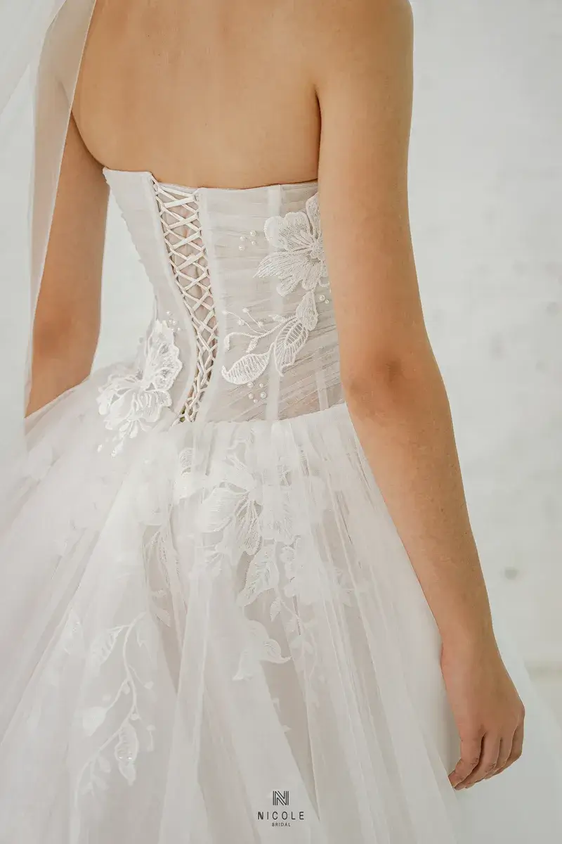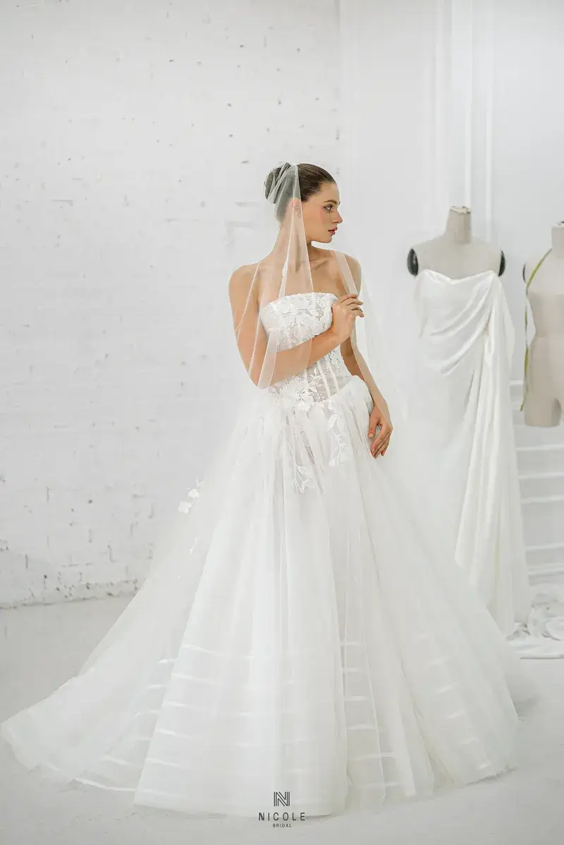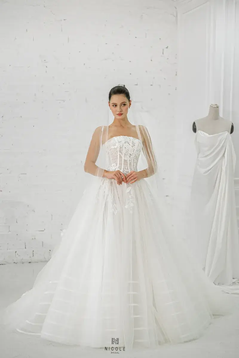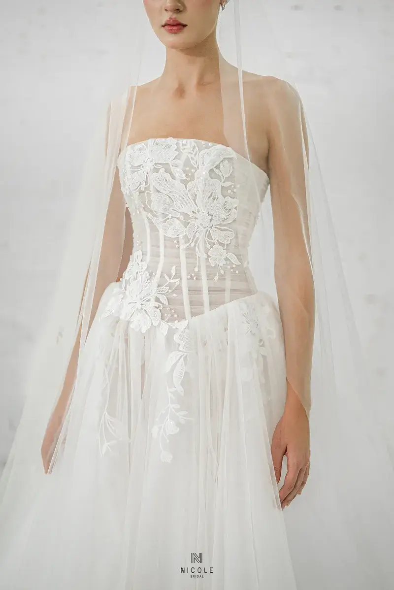 As one of the standout designs in the Te Amo collection, Tatiana embodies a bride who is pure, gentle, yet irresistibly enchanting. The gown is crafted from sheer lace layered with soft tulle, highlighting a delicate and pristine beauty. The sweetheart corset is refined with hand-applied 3D floral motifs and tiny pearls, like early-morning petals blooming softly against her smooth skin. The lightly voluminous skirt flows gracefully, reminiscent of white clouds embracing each step, bringing a sense of elegance and sweetness. With Tatiana, Nicole Bridal conveys a simple yet profound message: the most beautiful love is always born from subtlety, gentleness, and sincerity.