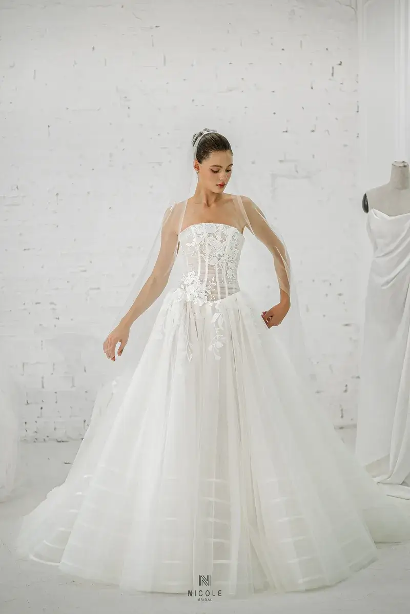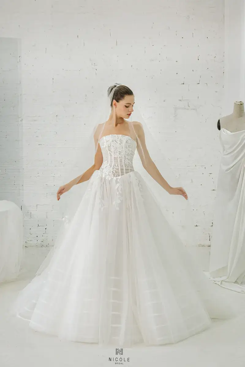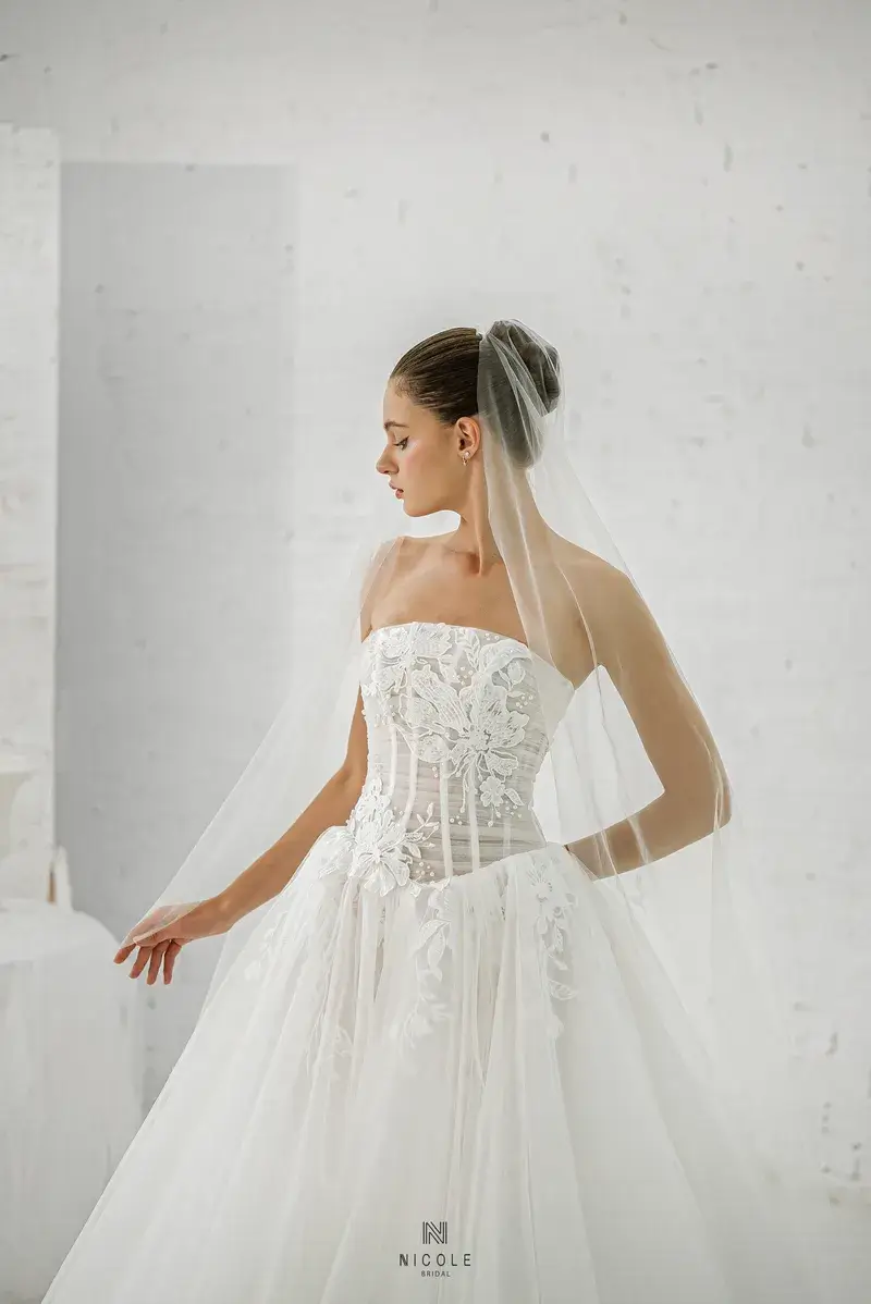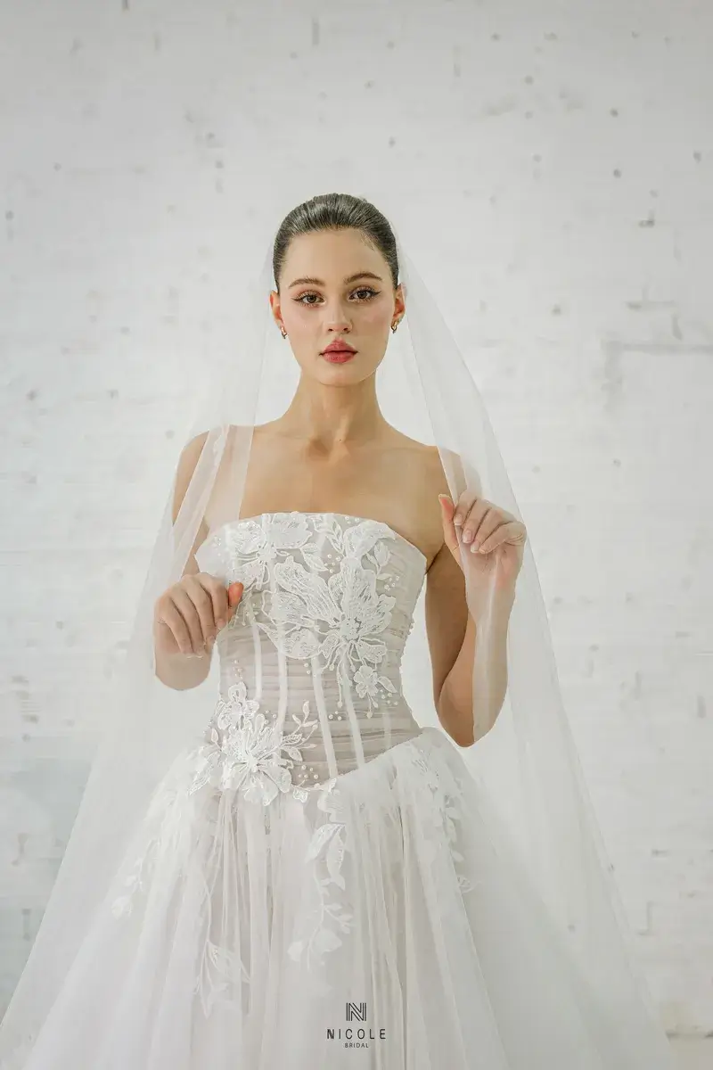 As one of the standout designs in the Te Amo collection, Tatiana embodies a bride who is pure, gentle, yet irresistibly enchanting. The gown is crafted from sheer lace layered with soft tulle, highlighting a delicate and pristine beauty. The sweetheart corset is refined with hand-applied 3D floral motifs and tiny pearls, like early-morning petals blooming softly against her smooth skin. The lightly voluminous skirt flows gracefully, reminiscent of white clouds embracing each step, bringing a sense of elegance and sweetness. With Tatiana, Nicole Bridal conveys a simple yet profound message: the most beautiful love is always born from subtlety, gentleness, and sincerity.