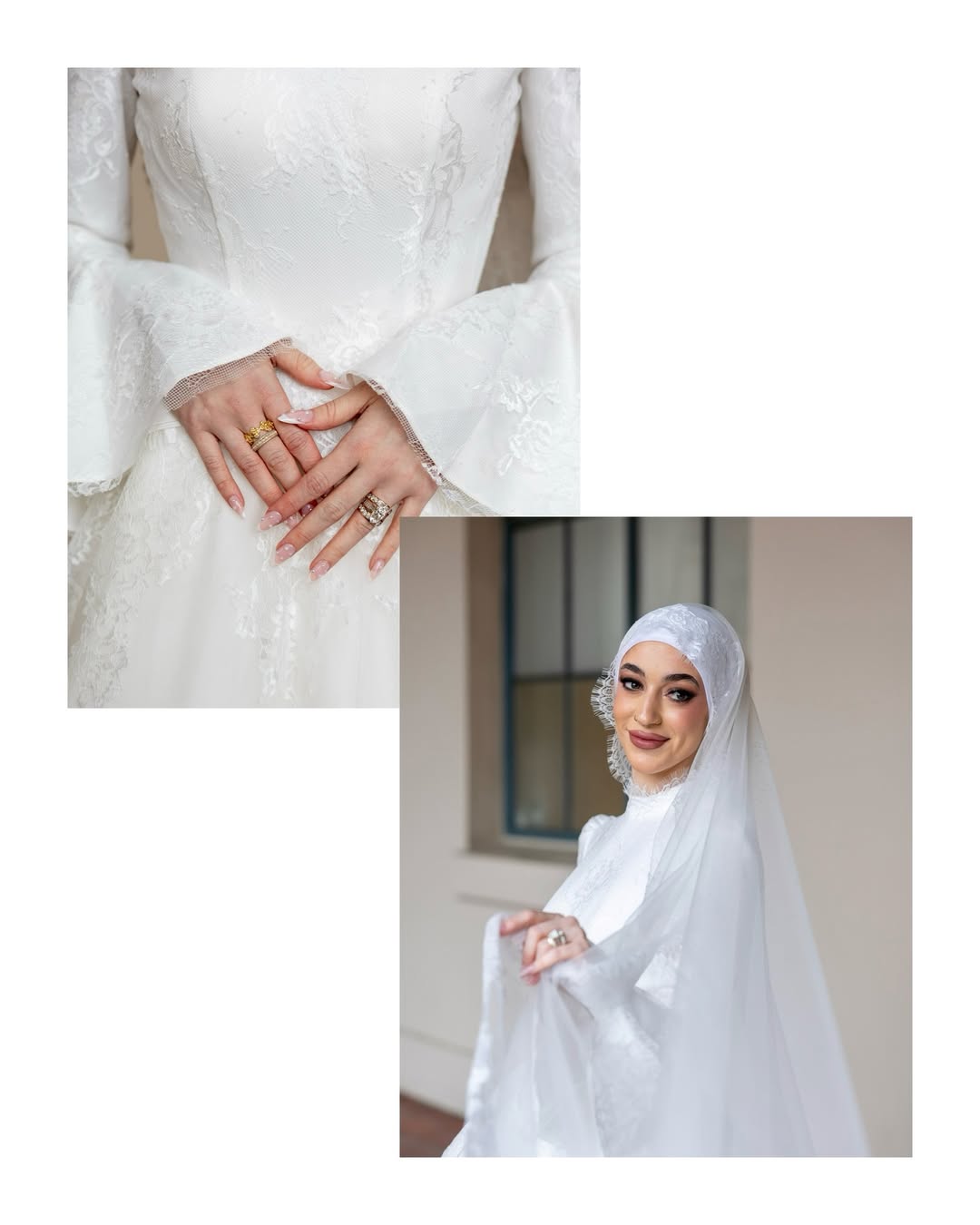 Thiết kế được lựa chọn là một chiếc váy cưới cổ cao, tay dài, kết hợp cùng lớp váy cưới ren mềm mại phủ trên thân váy. Phần tay áo được xử lý với dáng loe nhẹ nhàng, tạo nên chuyển động mềm mại mỗi khi cô dâu bước đi. Phom váy xòe nhẹ giúp tổng thể trở nên thanh thoát, đồng thời vẫn giữ được vẻ kín đáo đúng với tinh thần của một chiếc váy cưới cho người Hồi giáo.