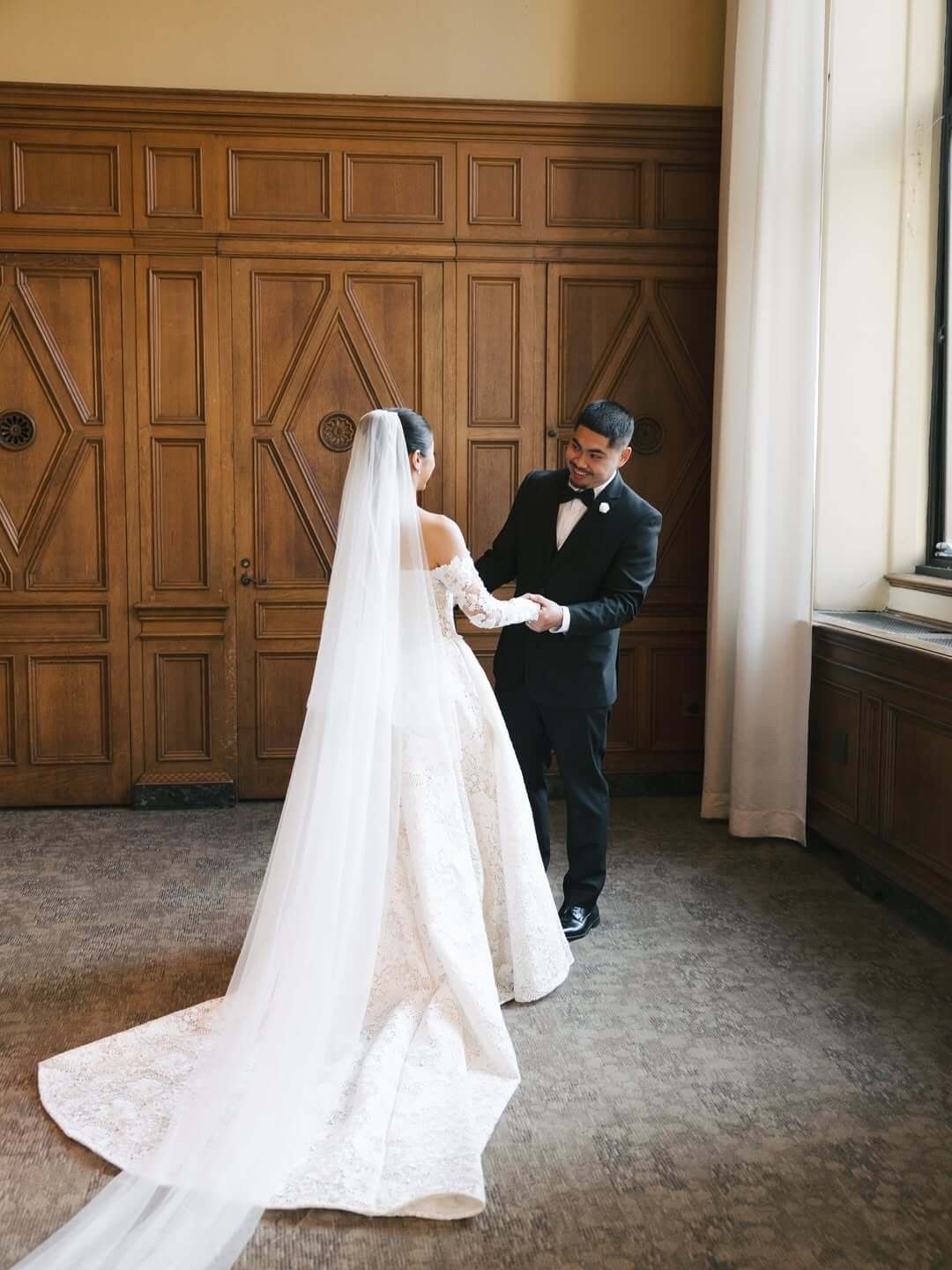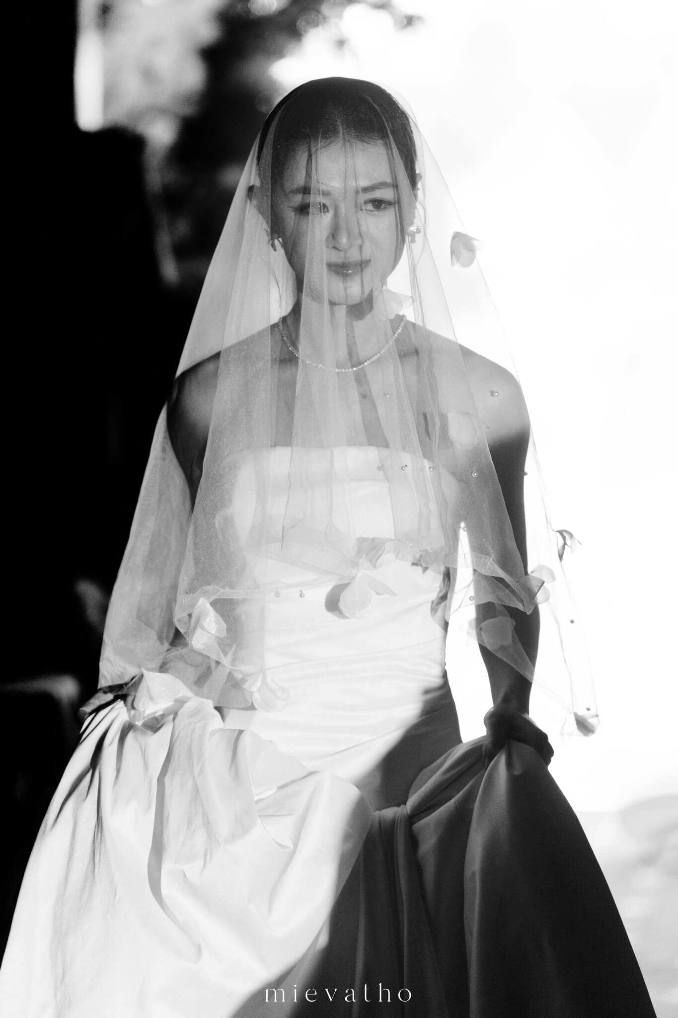 Đây là lựa chọn kinh điển cho những chiếc lúp cưới dài như cathedral veil hay chapel veil. Tóc búi thấp không chỉ giữ lúp vững chắc mà còn tôn lên vẻ sang trọng, cổ điển. Với phong cách này, cô dâu sẽ trông như bước ra từ những lễ đường châu Âu cổ kính, nơi sự trang nghiêm và lãng mạn giao hòa.