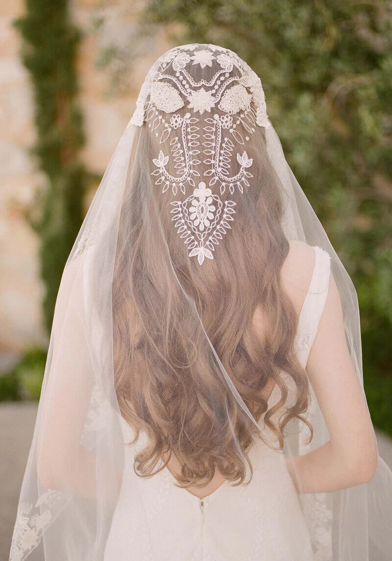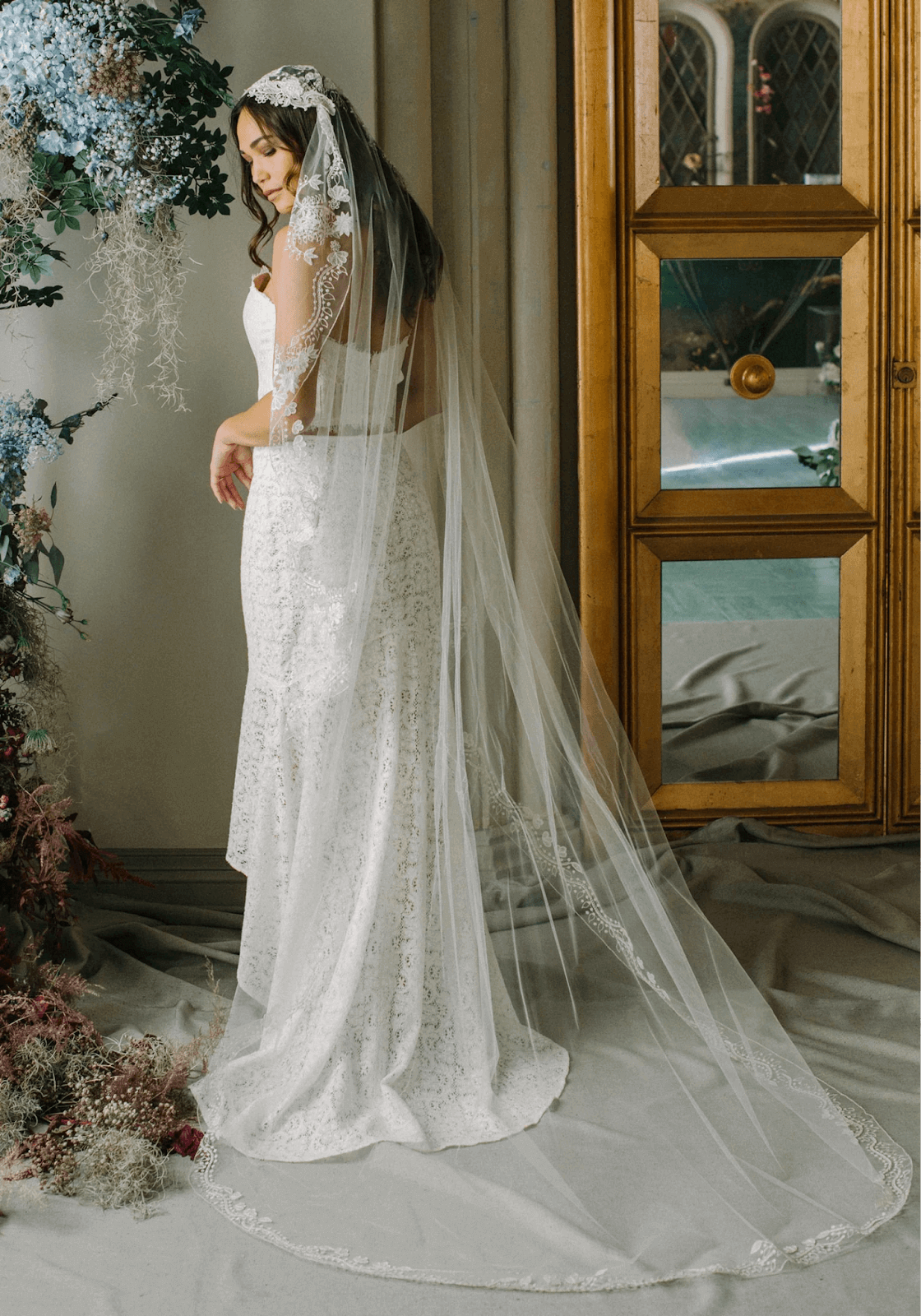 Nếu nàng đang hướng đến một vẻ đẹp huyền ảo và cổ điển, hãy thử chiếc lúp dài chấm đất với viền ren thêu hoa li ti. Khi tung bay trong gió, tấm voan ấy sẽ khiến nàng trông như một nữ thần trong khoảnh khắc bước vào lễ đường.
