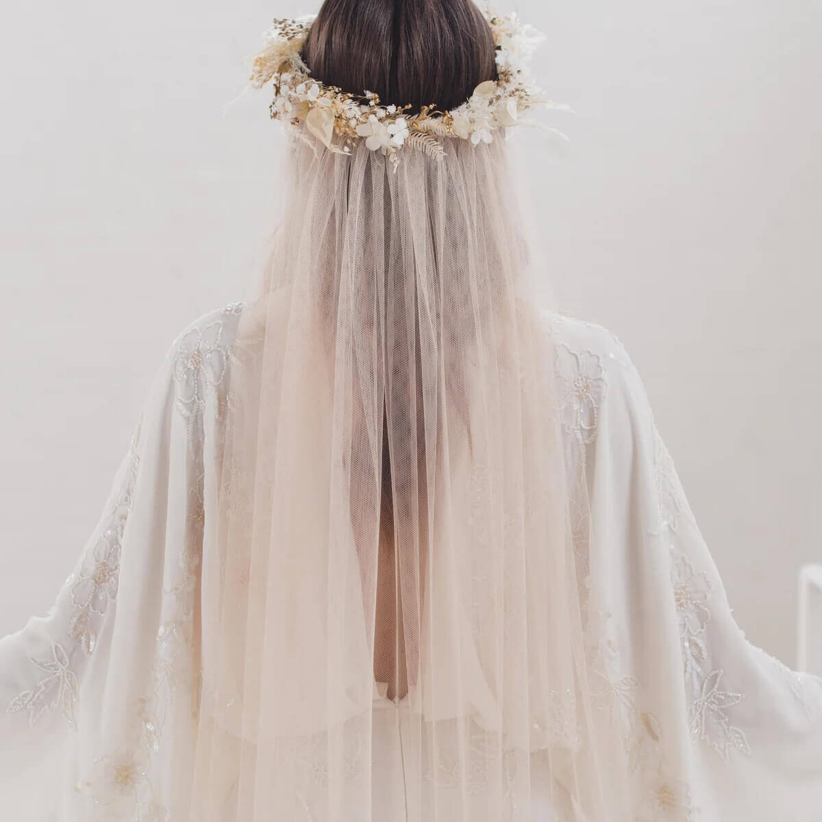 Không giống những mẫu veil cô dâu ngắn truyền thống thường gắn liền với sự trang nghiêm, lộng lẫy, lúp boho lại gây ấn tượng bằng sự bay bổng và tự nhiên. Một chiếc lúp cưới boho đẹp thường mang các đặc điểm: