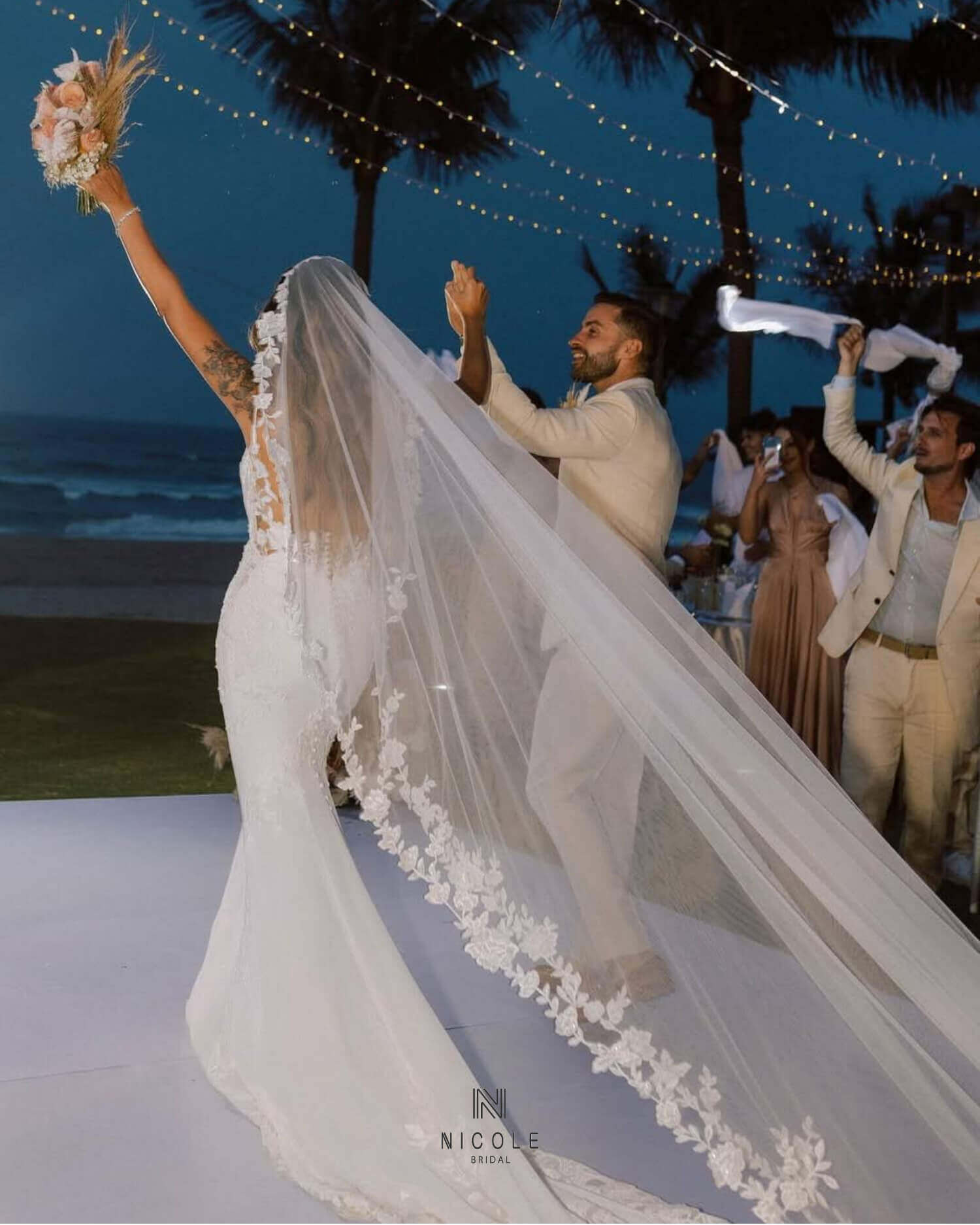 Với những buổi lễ tổ chức tại resort hoặc không gian cao rộng, cô dâu có thể chọn lúp cưới dài cathedral hoặc chapel để tạo hiệu ứng lãng mạn. Lúp dài sẽ giúp khung cảnh thêm phần tráng lệ, đặc biệt khi ánh sáng chiều buông xuống.