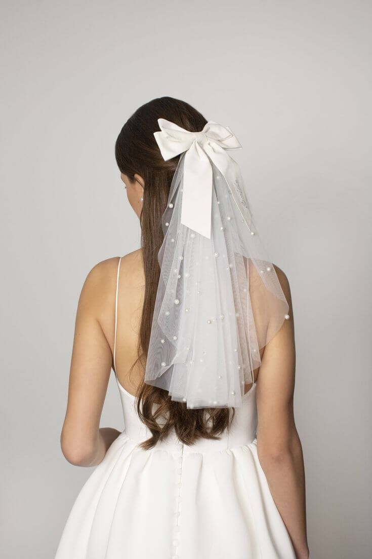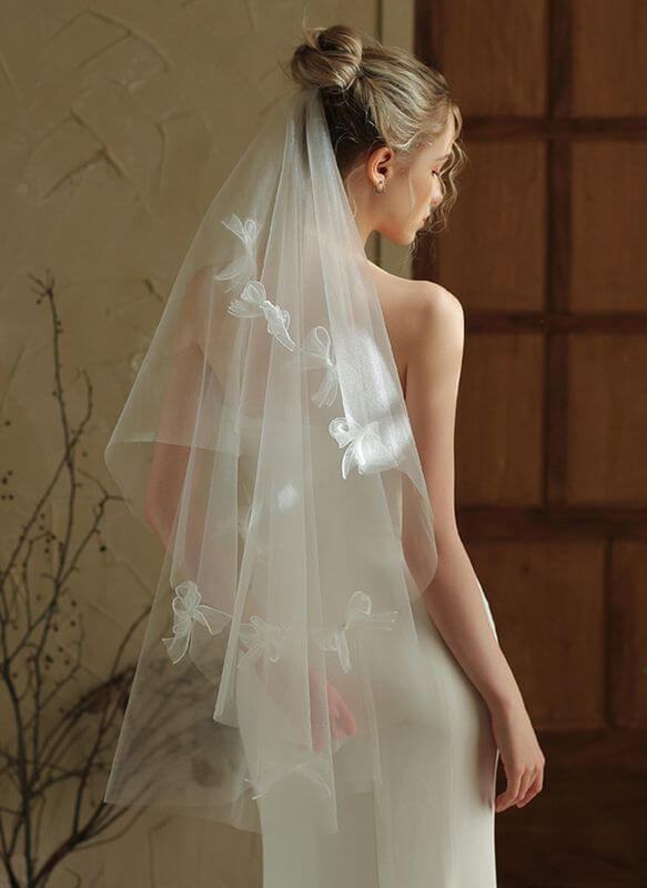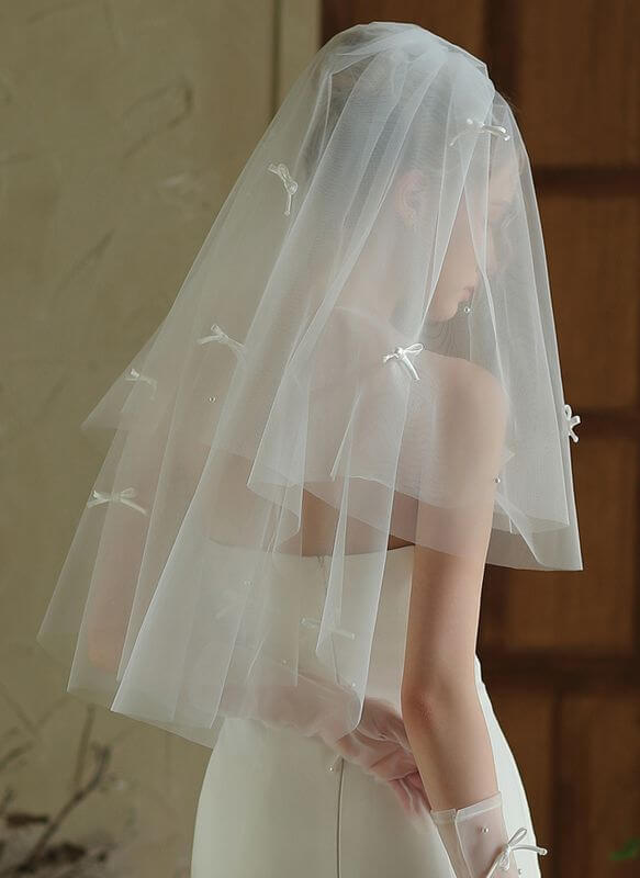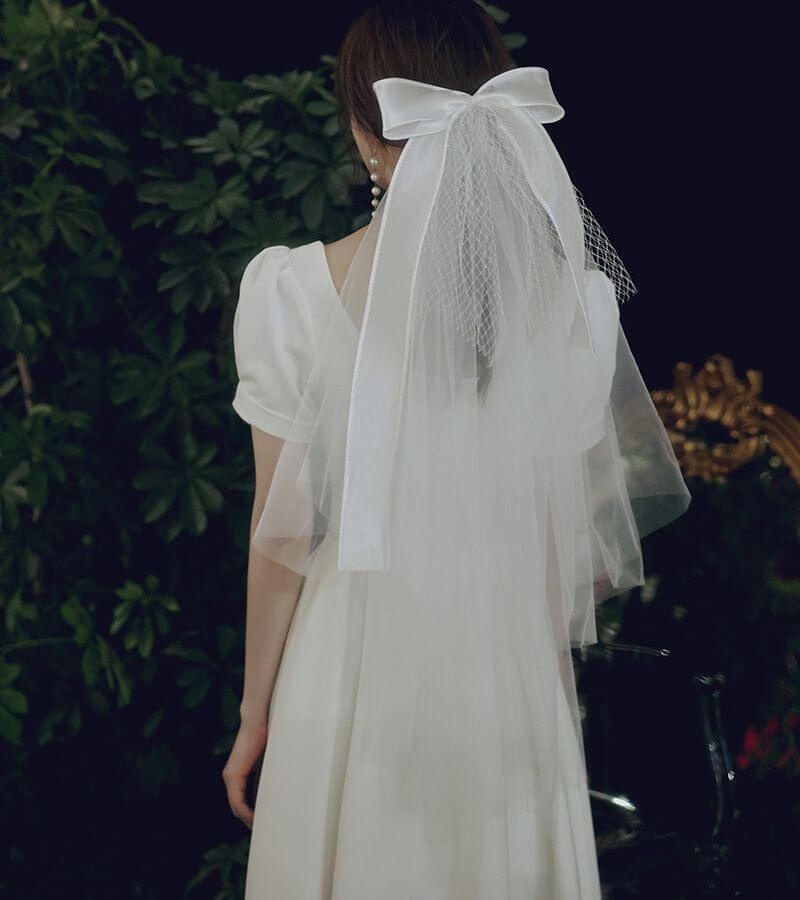Hình ảnh nơ buộc trên mái tóc, khi gắn cùng lớp tulle mỏng manh, mang đến vẻ đẹp trong sáng và hiện đại. Đây là lựa chọn dành cho những cô dâu muốn có một dấu ấn ngọt ngào, tinh nghịch nhưng vẫn thanh lịch trong ngày cưới.