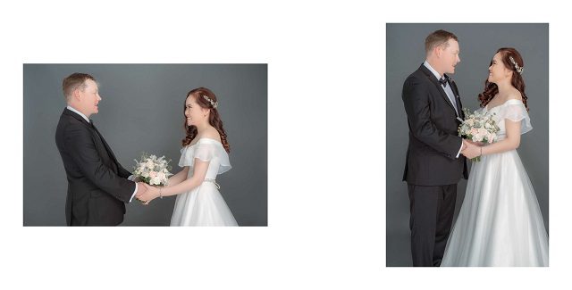 Một trong những cách tạo dáng đơn giản nhất khi chụp ảnh tại Studio đó là 2 nhân vật chính sẽ nhìn nhau say đắm. Với ánh mắt yêu thương, nhìn nhau dịu dàng của dâu rể đã có thể làm cho khung hình như bừng sáng và tạo điểm nhấn sâu sắc.