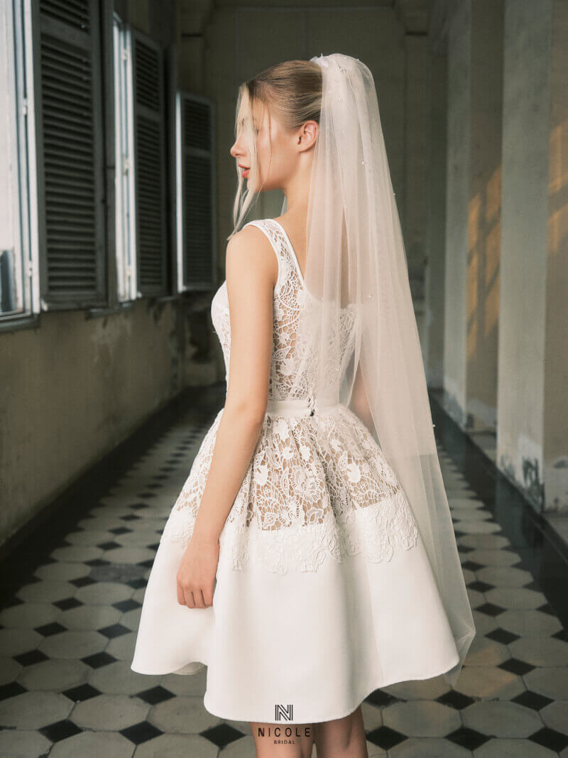 Váy cưới ngắn ZARA mang đến vẻ đẹp tinh tế, pha lẫn sự quý phái của thời đại cổ điển. Với chất liệu ren mềm mại kết hợp cùng satin phần gấu váy, từng đường nét của ZARA như tôn lên sự sang trọng và thanh lịch cho cô dâu. Kiểu dáng midi nhẹ nhàng ôm trọn cơ thể, thiết kế dựng gọng corset giúp nàng giữ trọn vẻ kiêu sa, đài các. Mẫu váy này không chỉ là lựa chọn hoàn hảo cho một đám cưới hiện đại mà còn là lời tôn vinh phong cách hoàng gia vượt thời gian.