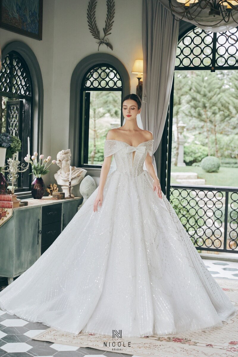Váy cưới công chúa trễ vai