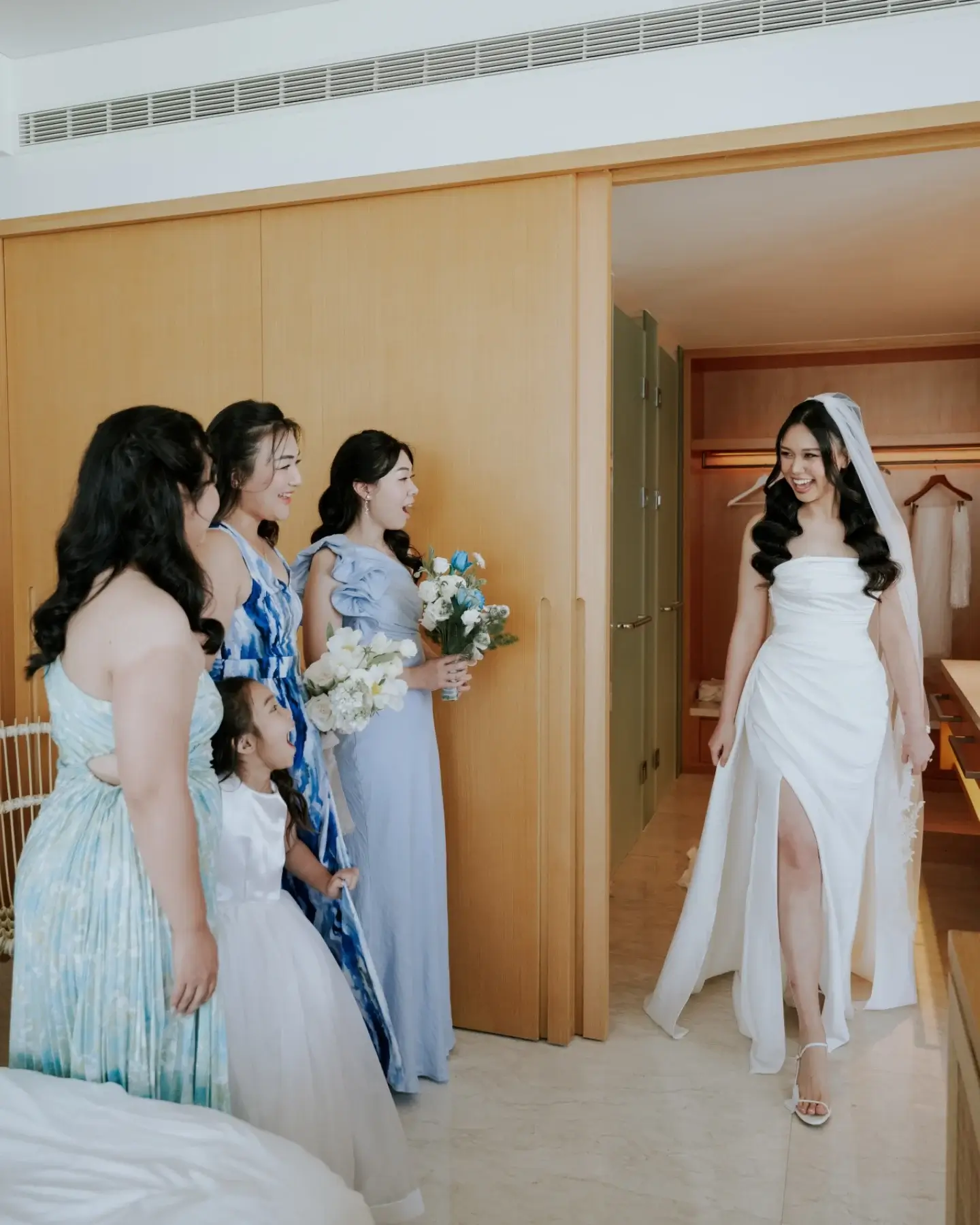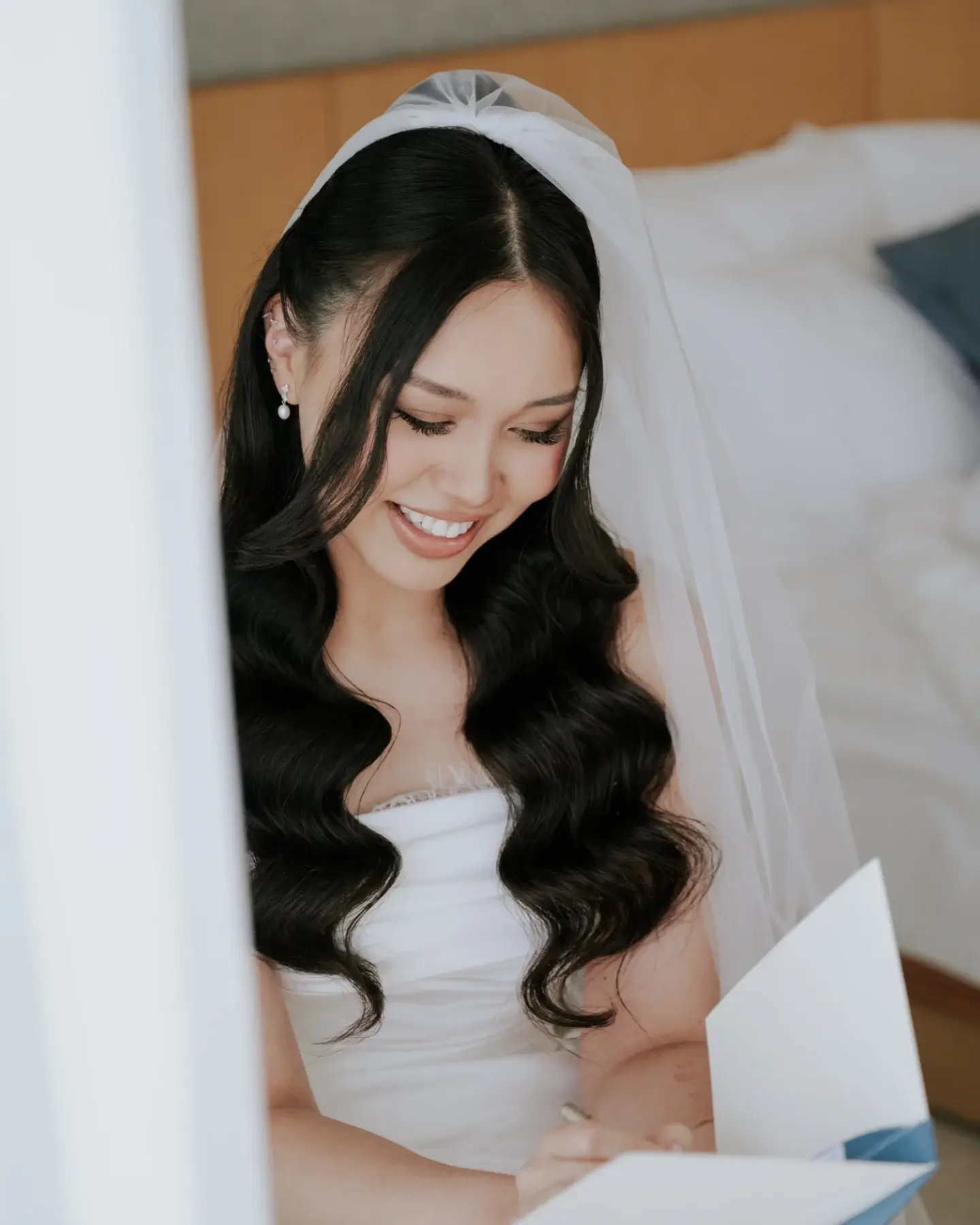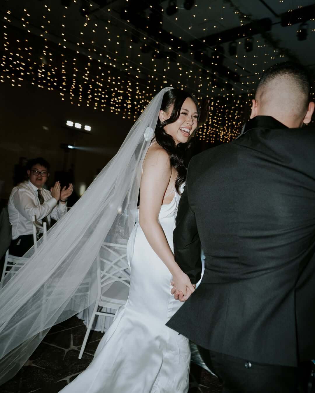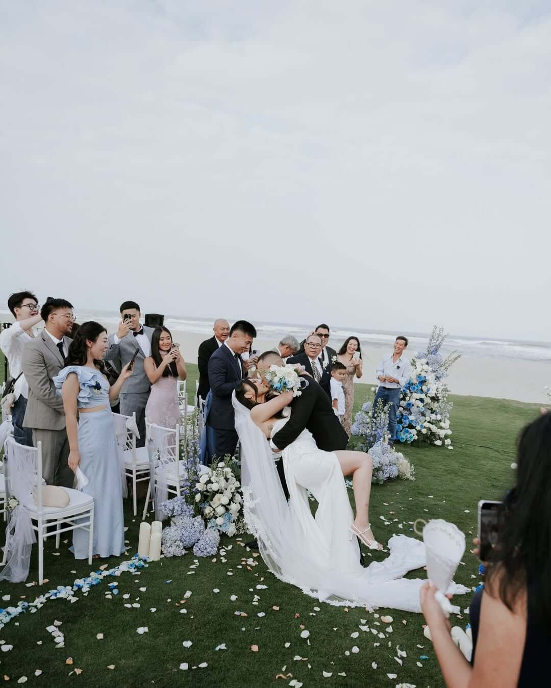 Trong buổi lễ khi nàng bước đi trên cát trắng, tà váy lay nhẹ theo từng cơn gió biển, lấp lánh dưới ánh hoàng hôn, mọi thứ trở nên hoàn hảo. Veil cưới cũng được Tracy lựa chọn theo tinh thần nhẹ nhàng, tối giản, tạo nên một tổng thể thanh thoát và tinh khôi, như một nốt lặng lãng mạn giữa khung cảnh thiên nhiên bao la. Giữa muôn vàn lời chúc tụng, nụ cười của cô dâu Tracy Tang càng thu hút, rạng ngời hơn.